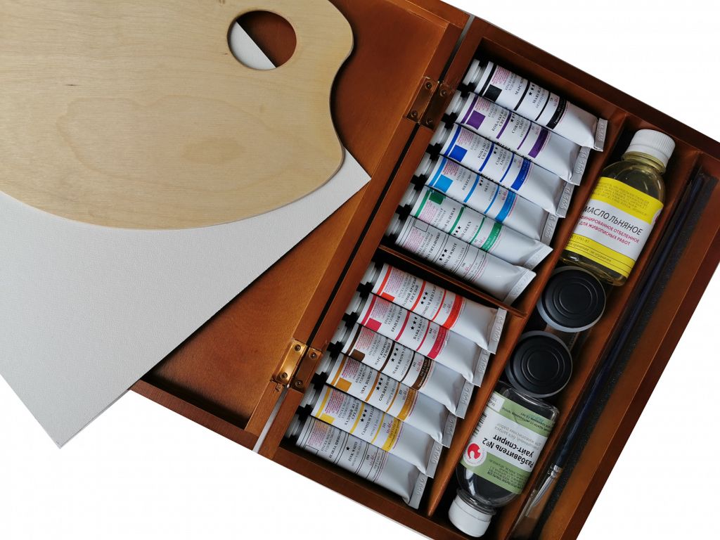 Подарочный набор от бренда «Подольск-АРТ Центр» станет отличным подарком для художника любого уровня. В наборе есть самый необходимый перечень материалов для масляной живописи. Набор поставляется в удобном деревянном кейсе презентабельного вида. Масло, выпускаемое заводом «Подольск-АРТ Центр», изготавливается только на натуральной основе. В производстве этих красок используется традиционная рецептура. Краски созданы на основе желтого янтаря, льняного масла, природных смол и экологически чистых пигментов. Краски этой серии светоустойчивы и интенсивны. Все цвета хорошо смешиваются друг с другом, образуя новые оттенки.