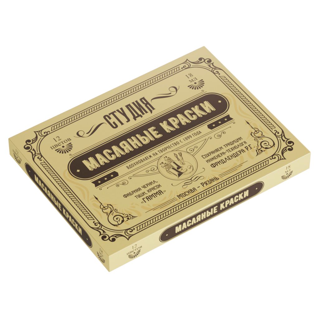 Масляные краски "Гамма" серии "Студия" "Юбилейная" изготавливаются из льняного масла, органических и неорганических пигментов. Кадмиево- кобальтовая группа заменена имитацией, что делает краски безопасными. Также в состав красок входит пчелиный воск, он придает краскам пастозную консистенцию и предотвращает от растрескивания после высыхания. Цветовой диапазон включает в себя как укрывистые краски, так и прозрачные. Масляные краски подходят для обучения и начинающих художников.
