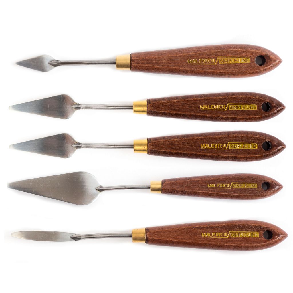 Мастихины различных форм для живописи масляными и акриловыми красками. Рабочая часть мастихина — нержавеющая сталь, ручка — бук. Тонкий упругий стальной инструмент в форме лопаточки или ножа - мастихин позволяет полноценно работать над картиной и писать ее от начала до конца, не используя кисть. В серии представлены мастихины с различной формой и размером рабочей части.