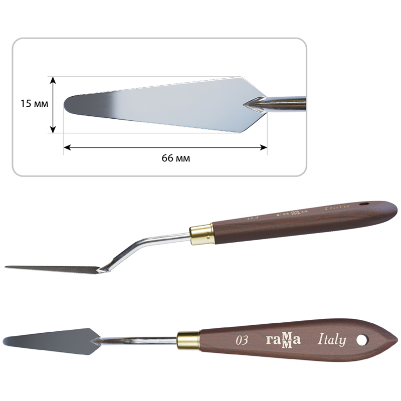 Мастихины серии «Старый Мастер» изготовлены вручную в Италии. Лезвие из нержавеющей стали прочное и упругое. Лезвие имеет специальное глянцевое покрытие для долговечной службы. Эргономичная ручка из натурального бука отполирована вручную и оснащена отверстием для хранения на подвесе. Бесшовная обойма гарантирует надежное соединение лезвия и ручки. Коллекция мастихинов представлена в 12 самых популярных видах лезвий: ромб, капля, «рыбка», овальное, прямоугольные.