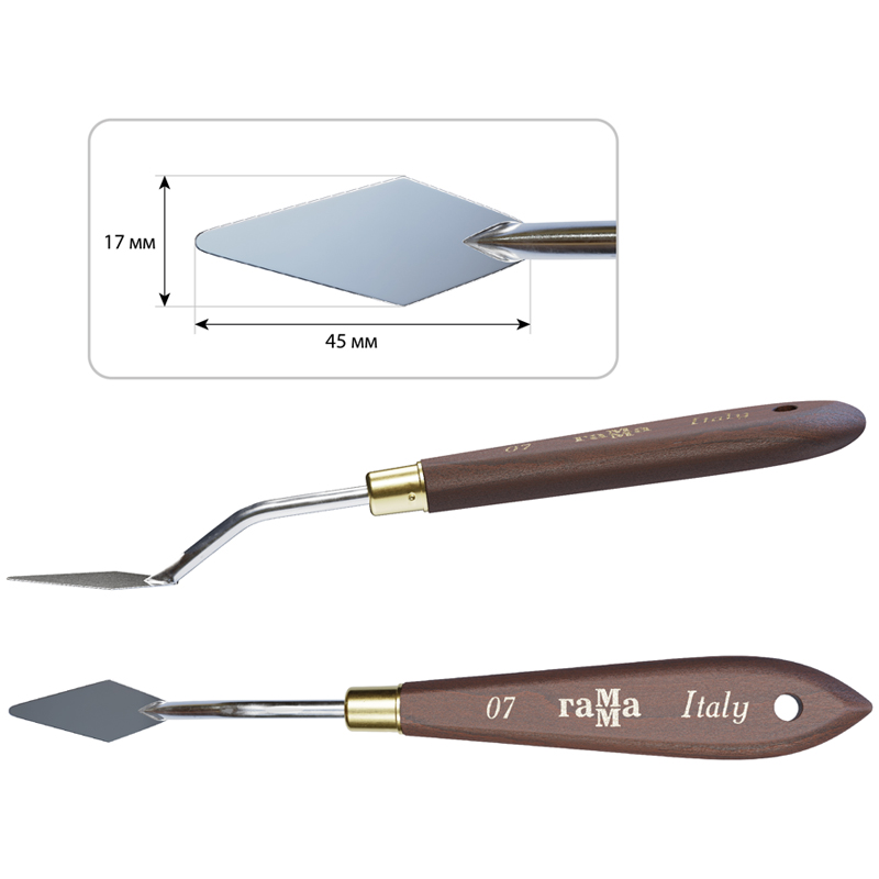 Мастихины серии «Старый Мастер» изготовлены вручную в Италии. Лезвие из нержавеющей стали прочное и упругое. Лезвие имеет специальное глянцевое покрытие для долговечной службы. Эргономичная ручка из натурального бука отполирована вручную и оснащена отверстием для хранения на подвесе. Бесшовная обойма гарантирует надежное соединение лезвия и ручки. Коллекция мастихинов представлена в 12 самых популярных видах лезвий: ромб, капля, «рыбка», овальное, прямоугольные.