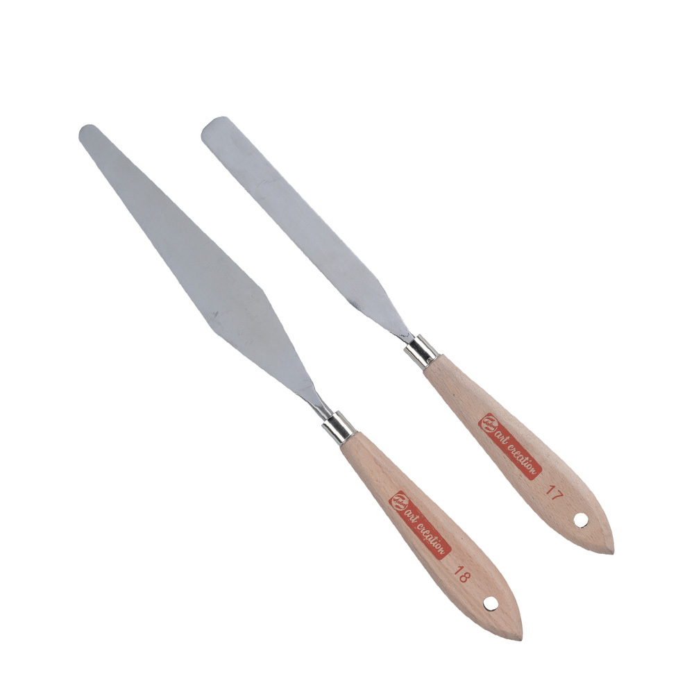Мастихины "Art Creation" от производителя ROYAL TALENS ? это идеальный инструмент для работы с масляными красками, акрилом или темперой. Набор из двух металлических мастихинов отлично подойдет для живописи, а также смешивания красок и нанесения тонкого слоя на большую поверхность. Мастихины выполнены из лучших материалов ? натурального дерева и нержавеющей стали. Ручка мастихина надёжно присоединена к лезвию, так что, можете быть уверены, что даже при самом интенсивном воздействии они не разболтаются. Лезвие мастихинов "Art Creation" достаточно гибкое и упругое, всегда возвращается в исходное положение, не портится и не мнётся. При правильном уходе, инструменты прослужат вам долгие годы, поэтому после взаимодействия с красками старайтесь протирать мастихин тряпочкой. Чтобы избежать засыхания комочков краски удаляйте все излишки после каждого использования. Мастихины "Art Creation" от производителя ROYAL TALENS сделают вашу работу выразительной и добавят изящества, а также упростят процесс взаимодействия с красками.