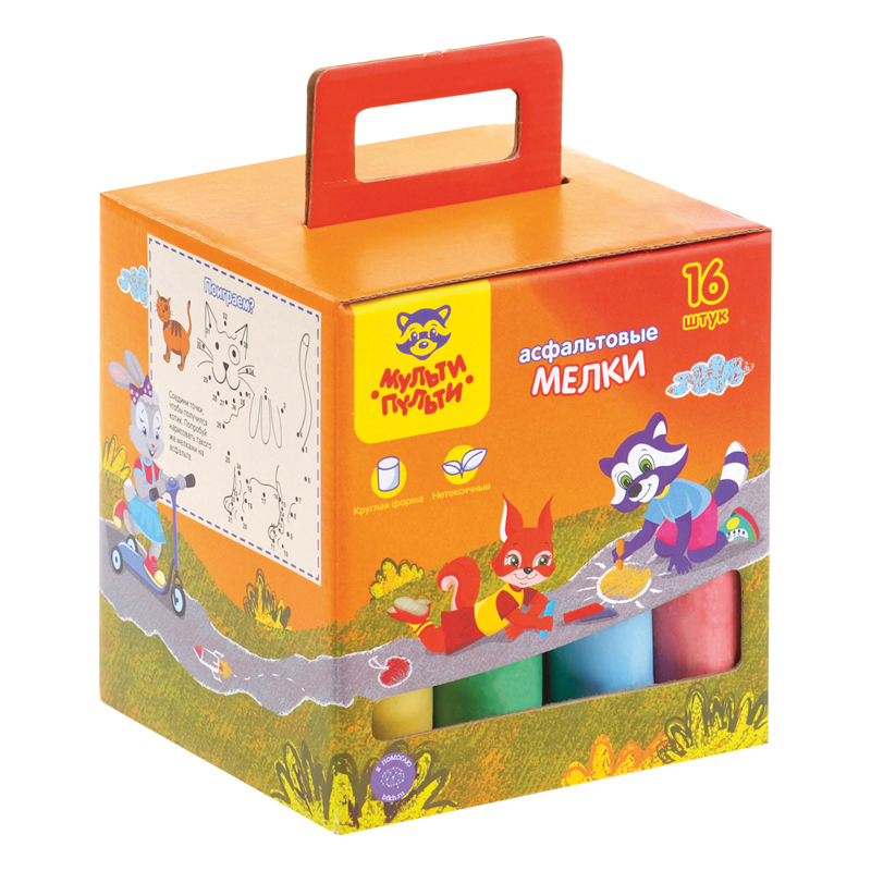 Набор из 16 круглых мелков для асфальта «Мульти-Пульти» идеально подходит для рисования на любой шероховатой поверхности. Длина мелка — 105 мм, а диаметр составляет 24 мм. В наборе 16 асфальтовых мелков в 6 цветах: 2 оранжевых, 2 белых, 3 жёлтых, 3 голубых, 3 красных и 3 зелёных. Удобная форма мела разработана специально для детей. Мел средней твёрдости подходит для детей старше 3-х лет.