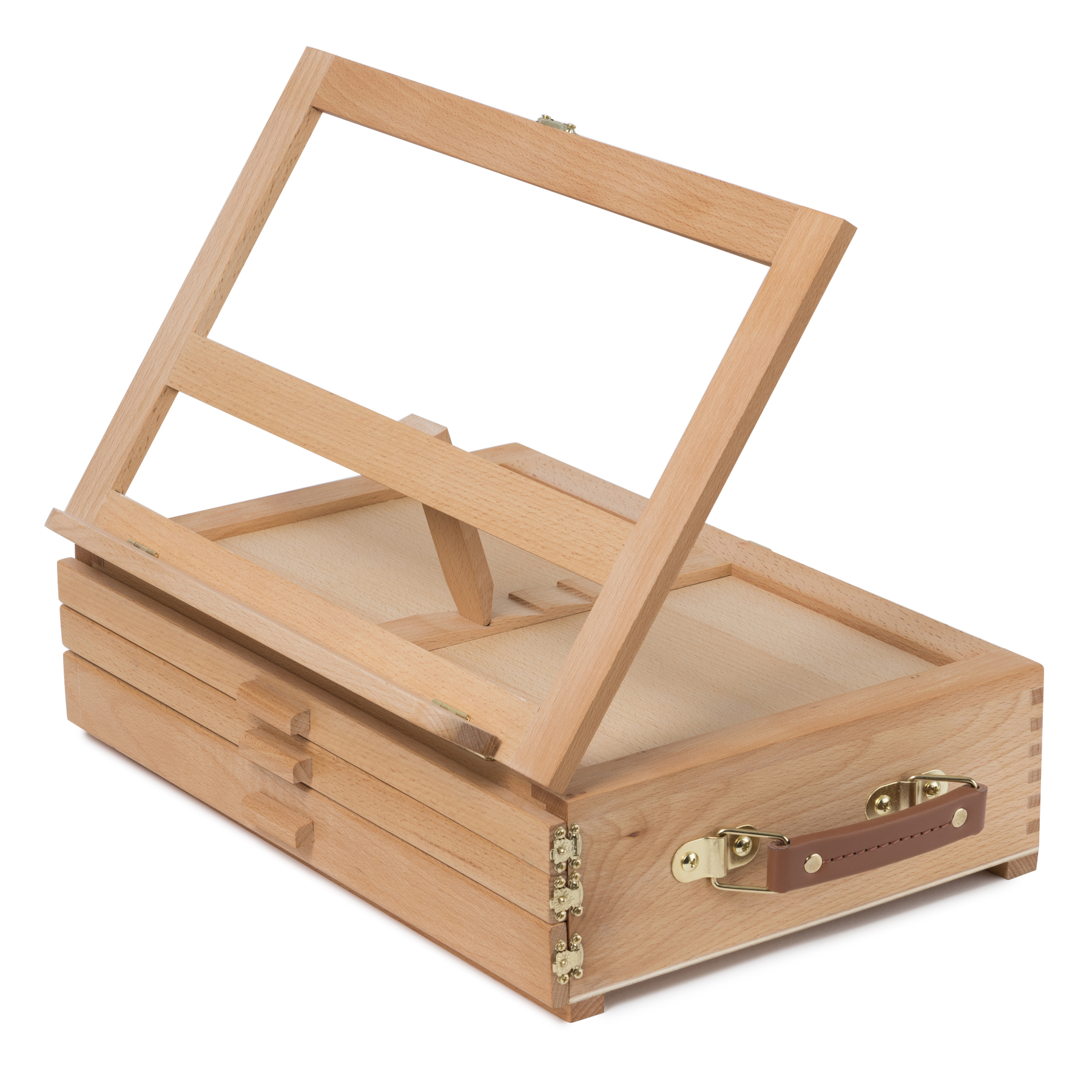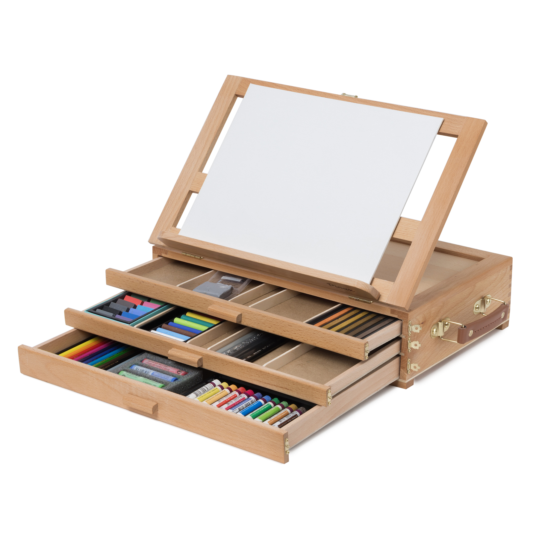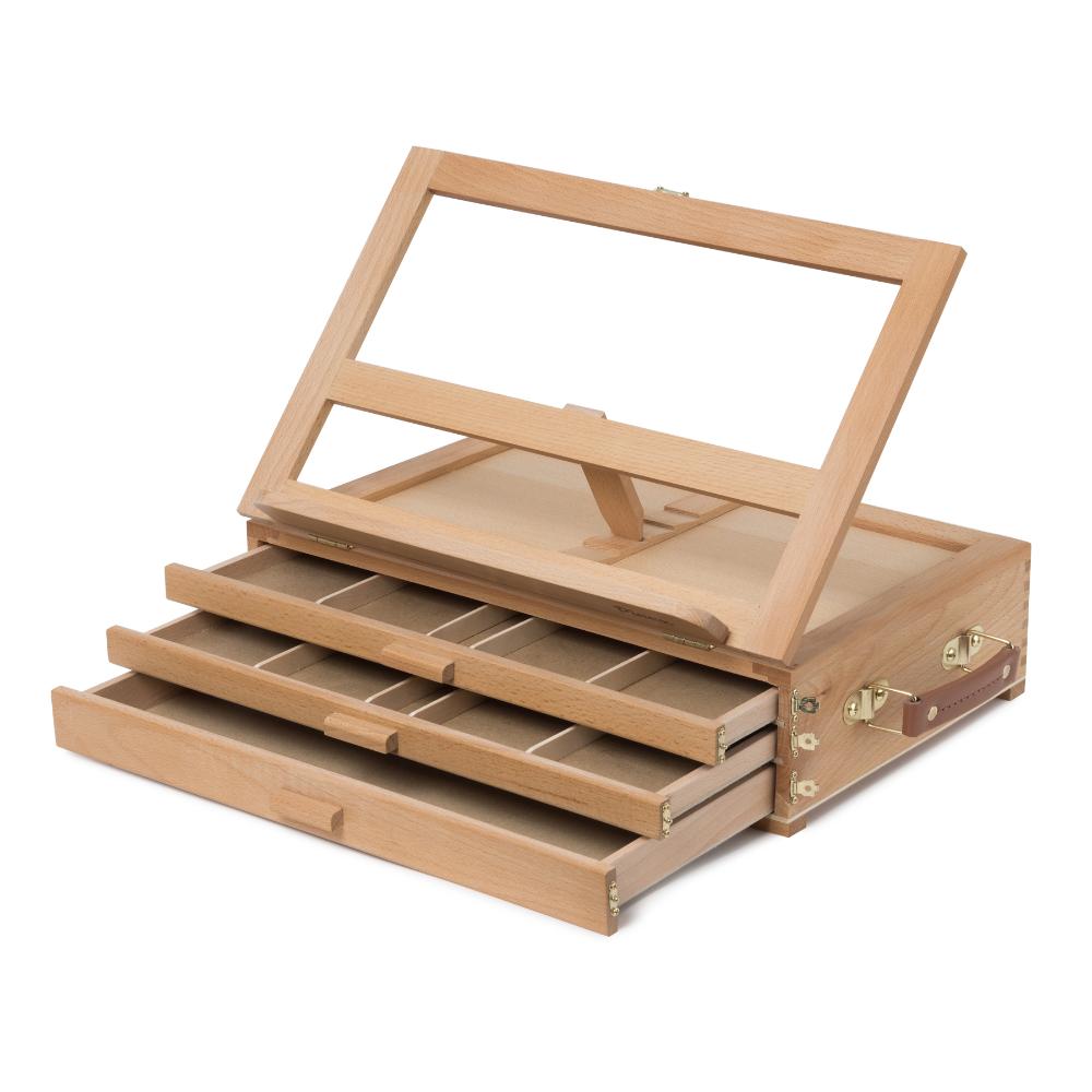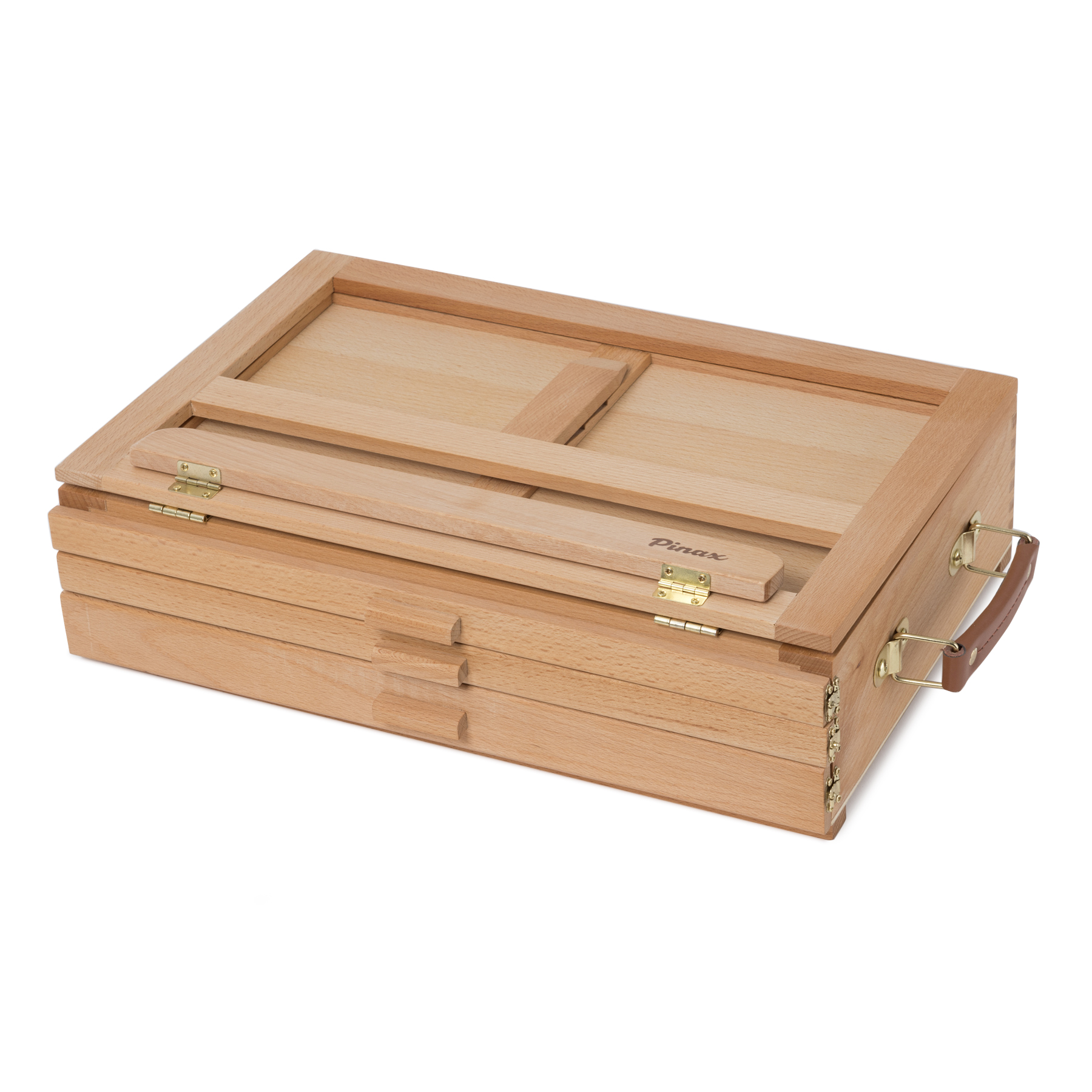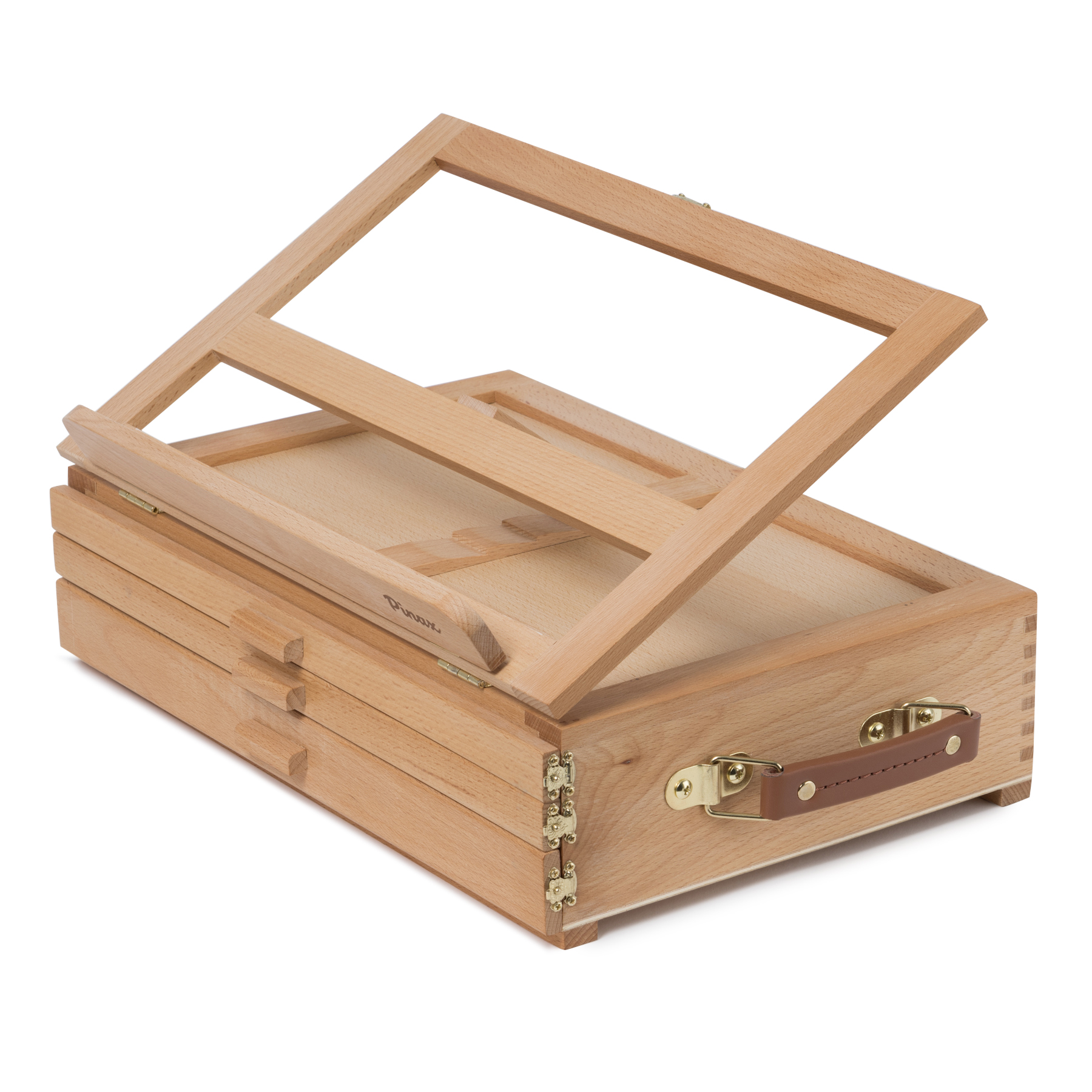 Компактный настольный мольберт обладает практичной конструкцией для удобного размещения необходимых аксессуаров и принадлежностей художника. Верхняя часть мольберта оснащена складной рамкой формата 40х24,5 см. с четырьмя уровнями наклона, внутри мольберта расположены 3 полочки для кистей, красок и мелких принадлежностей, мягкие подпятники позволяют комфортно разместить мольберт на рабочем месте. Мольберт выполнен из бука, размеры 40х27,5х12,5 см. Производство: данный товар представлен брендом Pinax. Pinax — мировой бренд товаров, который представлен на российском рынке с начала XXI века. Изначально компания производила только кисти для художественных работ, но затем расширила свое производство и не потеряв качество своей продукции начала производить холсты, мольберты и аксессуары для художников. Сейчас ассортимент включает в себя большое количество наименований.