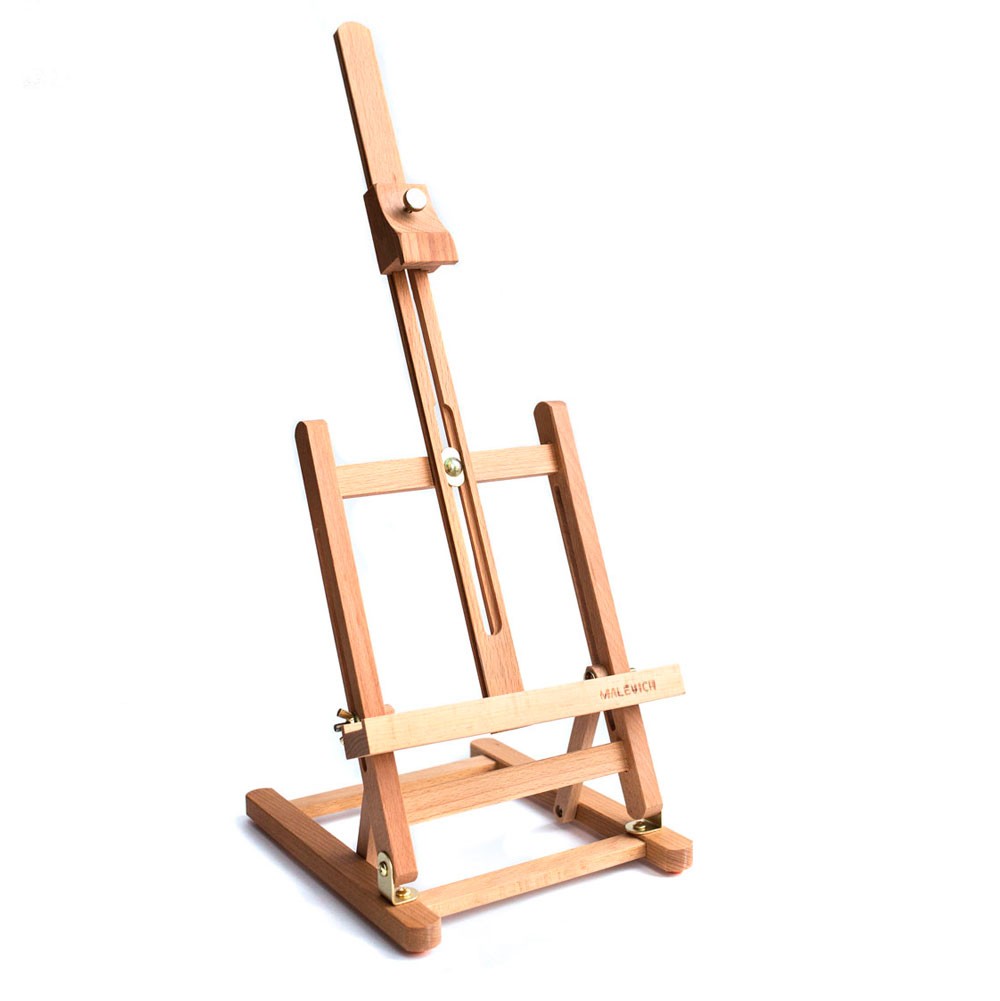 Миниатюрный настольный мольберт предназначен для работы не небольших форматах. Нижняя полки и верхний бегунок регулируются по высота. Наклон холста также можно изменять. Выполнен из бука. Ширина основания - 20 см, глубина - 24 см. Ширина полки - 21 см, глубина - 2 см. Высота - от 54 до 65 см. Глубина верхнего бегунка - 2.3 см. Максимальная высота холста - 40 см. Вес 1 кг.