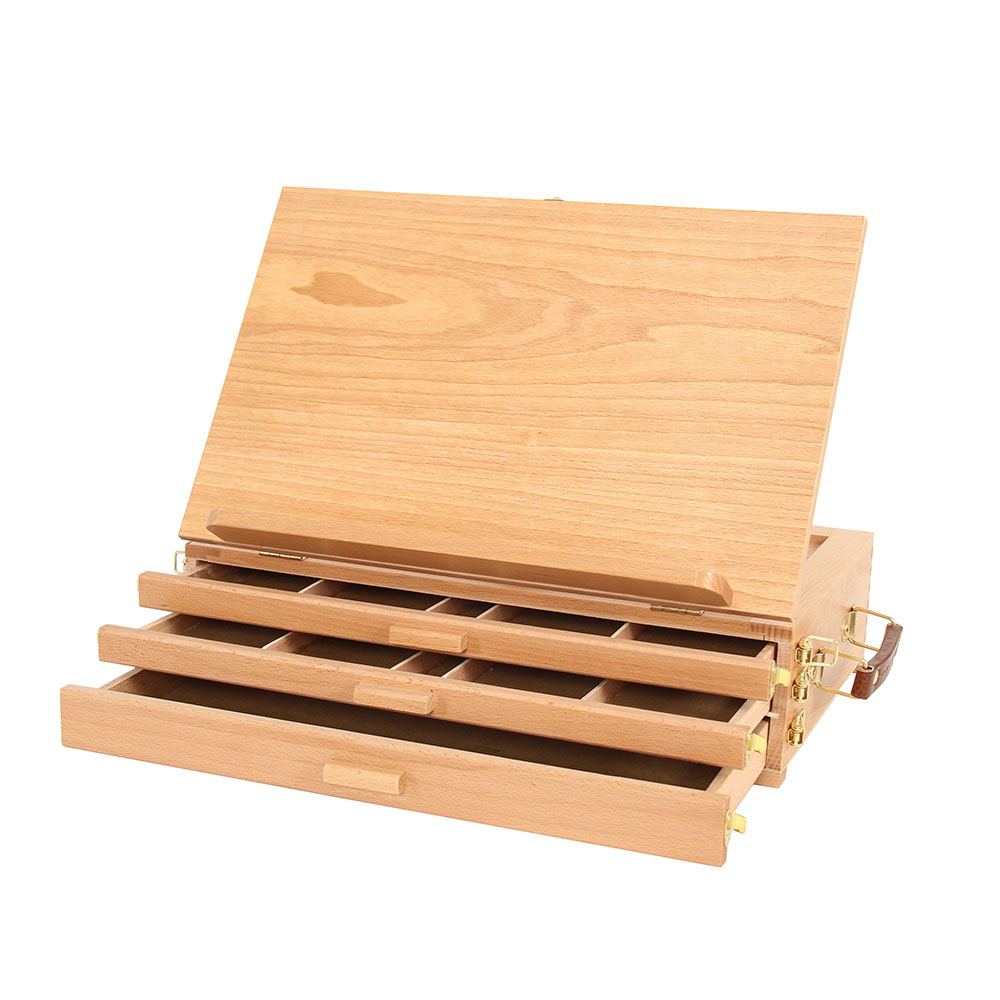 Настольный мольберт с планшетом позволяет работать на бумаге различными видами художественных материалов. Угол наклона планшета регулируется поперечной планкой на гребне вплоть до горизонтального состояния. Снизу предусмотрено три выдвижных ящика для красок, карандашей, пастели и различных инструментов художника. Мольберт оснащён замочками на ящиках и ручкой для удобства транспортировки и работы на пленэрах. Ширина - 42см, глубина - 28см. Высота в сложенном виде - 12,5см, в разложенном - 32,5см. Вес - 3кг.