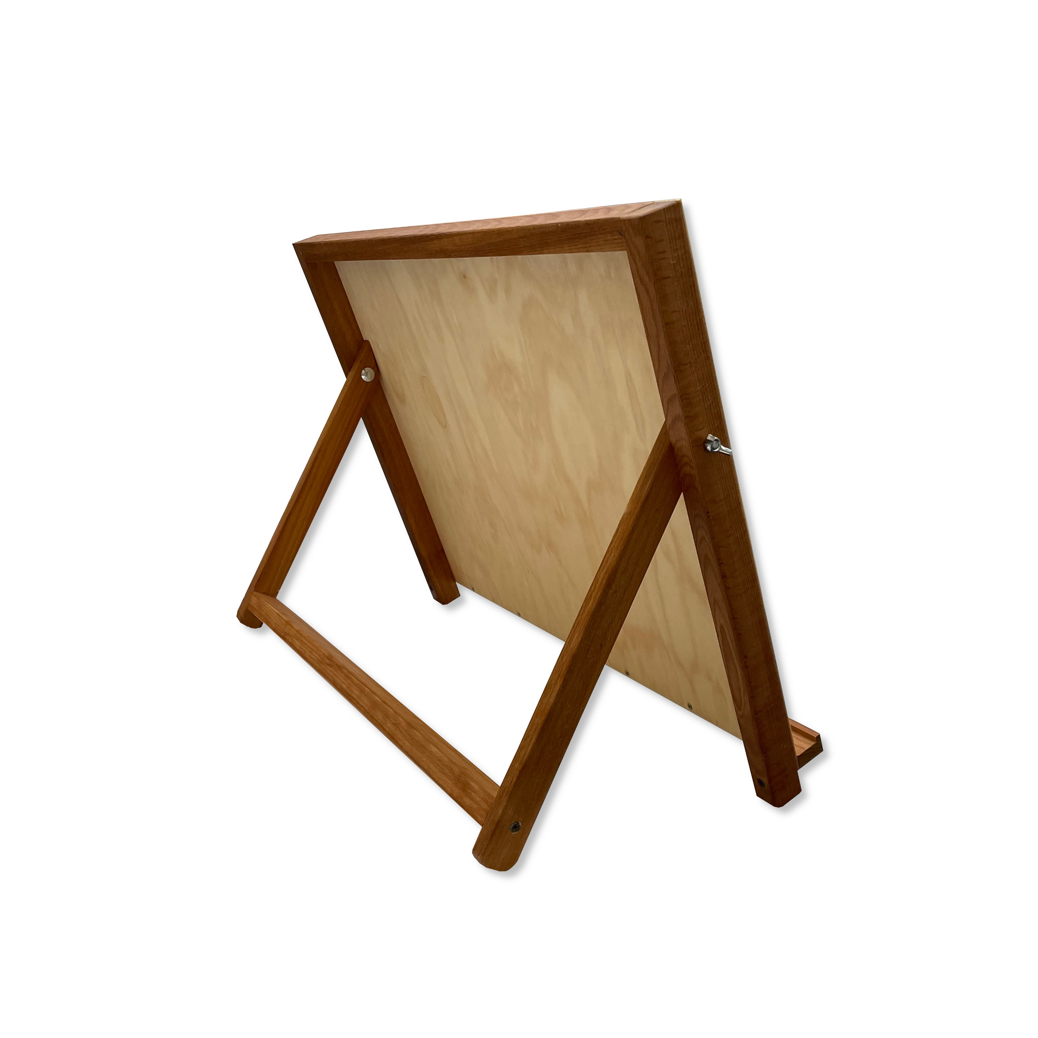 Небольшой настольный мольберт с фанерным планшетом и регулировкой наклона. Мольберт предназначен для эскизных работ на бумаге и картоне, а также для демонстрации картин, фотографий, рисунков. Мольберт изготовлен из высококачественного бука, который покрыт специальным защитным составом. Основа планшета — березовая фанера. Размер планшета 60х46 см.