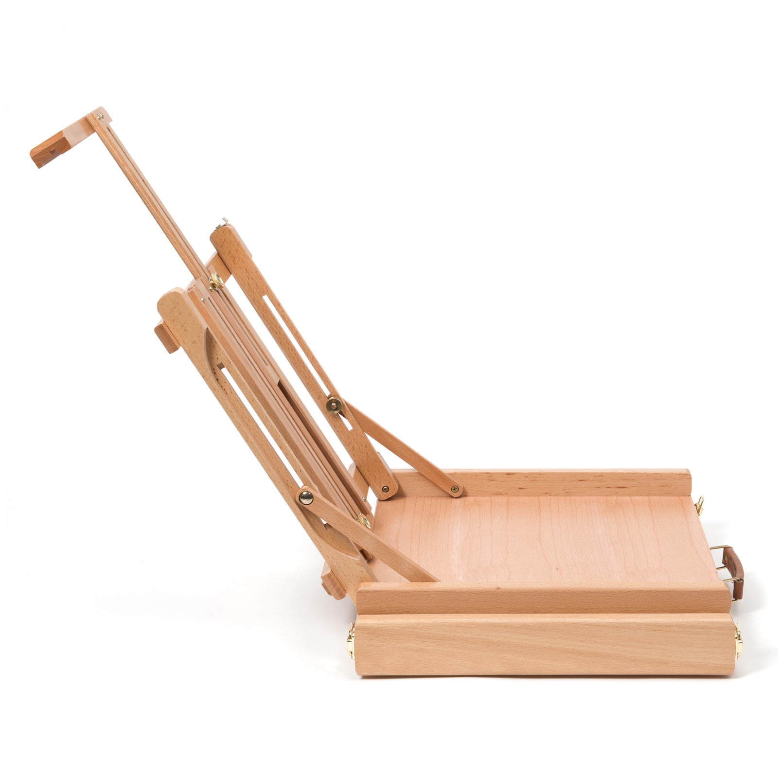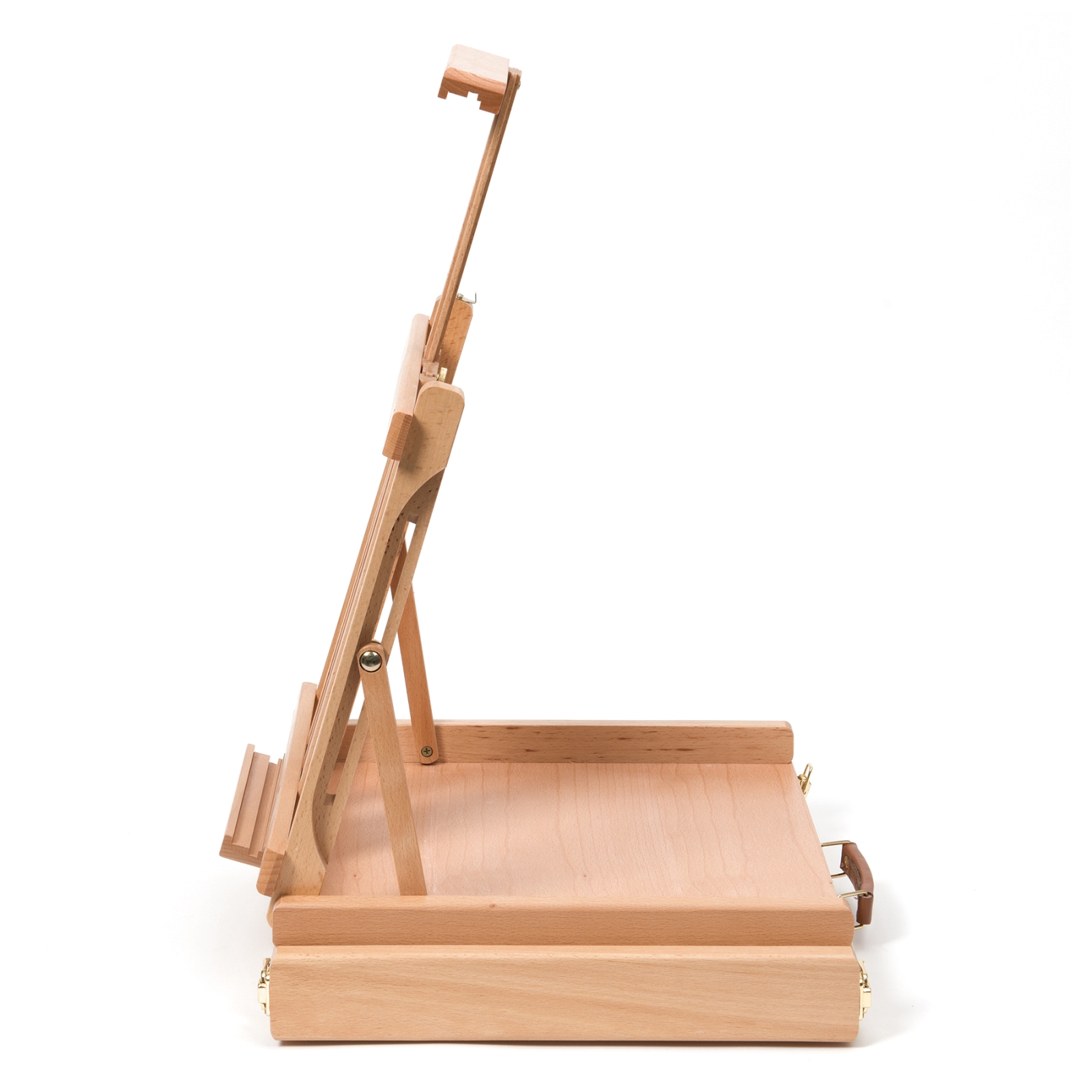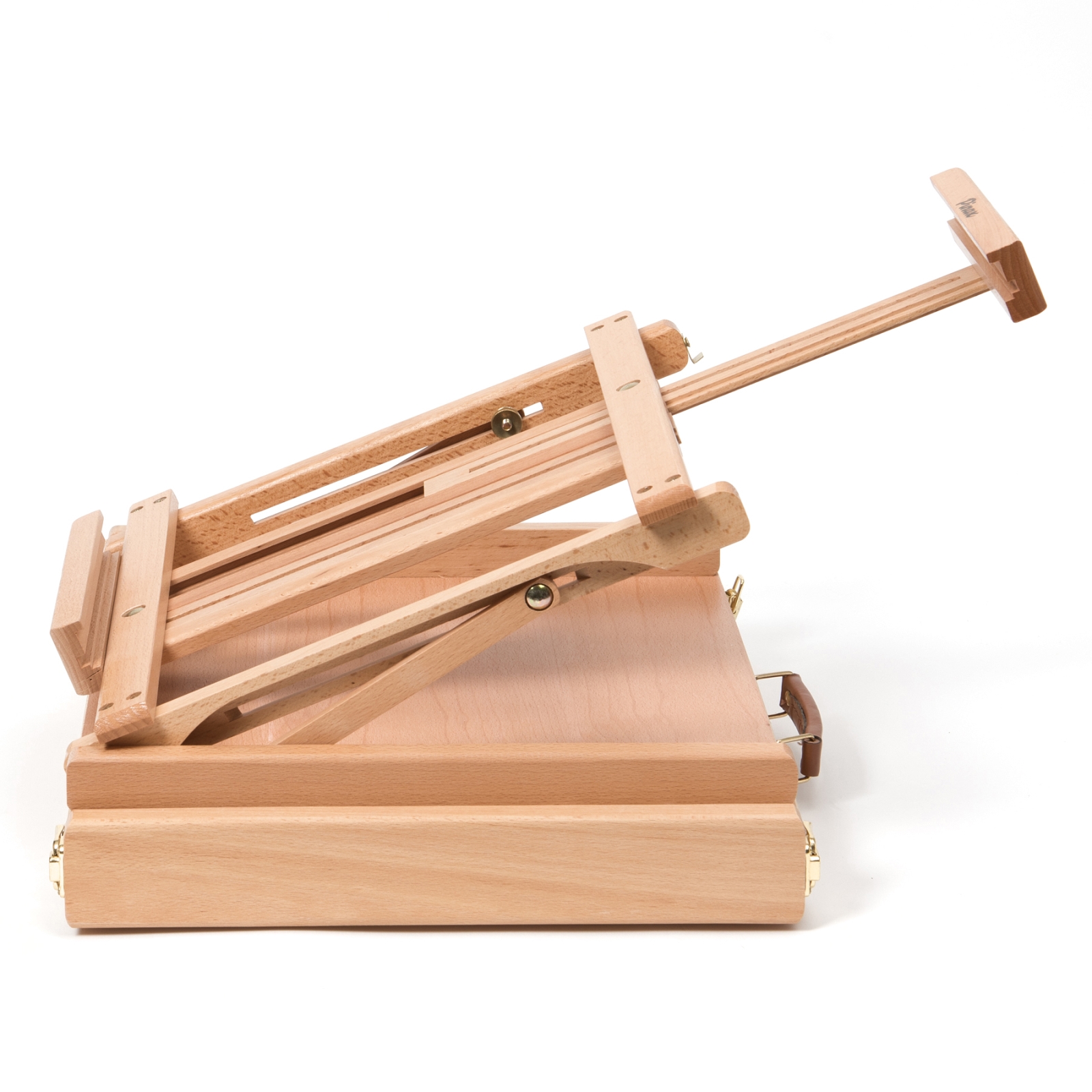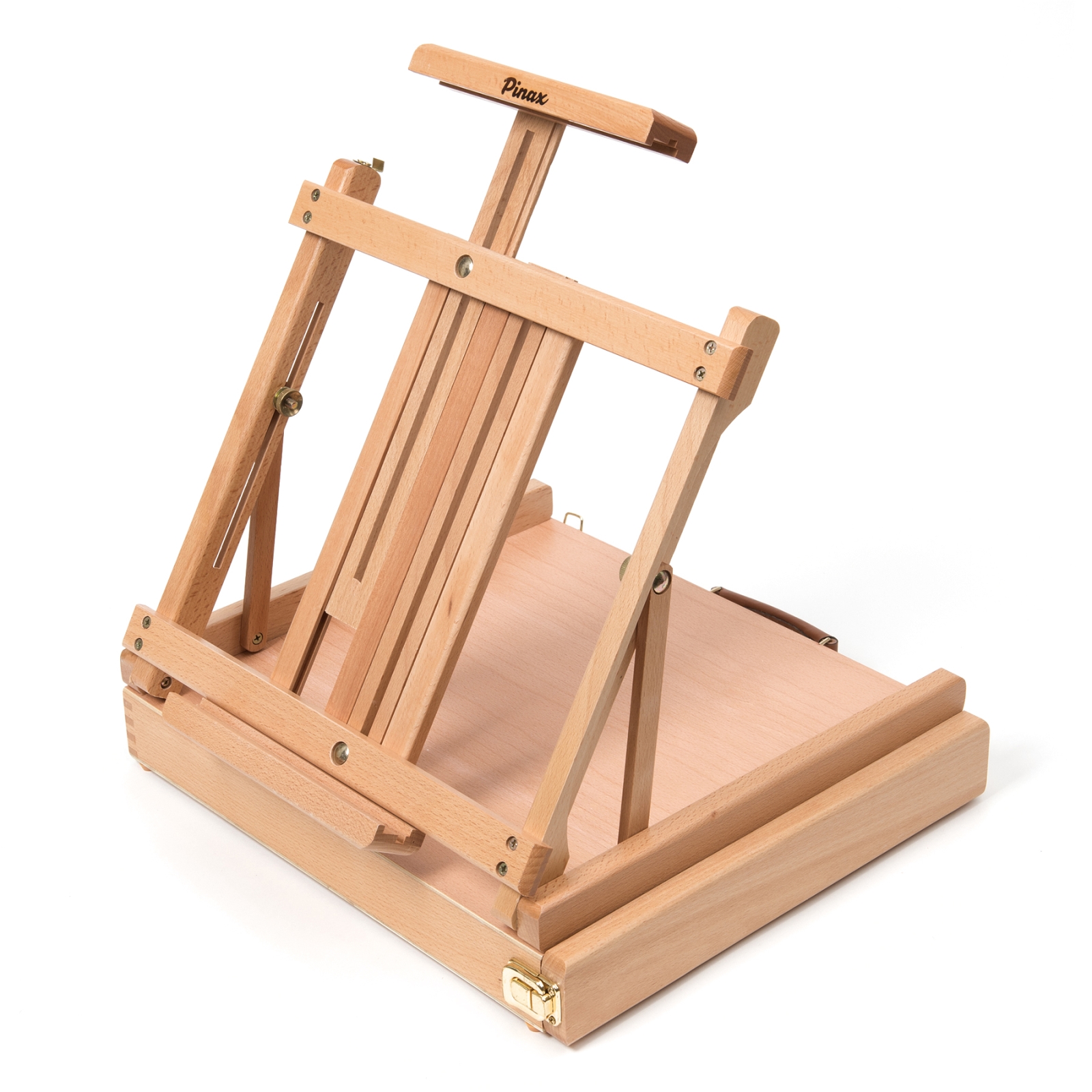 Большой настольный мольберт с ящиком для кистей и красок (этюдник) предназначен для работы на столе. Изготовлен из бука, пропитанного льняным маслом. Мольберт-этюдник снабжен специальным ящиком для художественных принадлежностей. Угол наклона и высота штанги регулируется. Максимальная высота холста - 85 см. Мольберты Pinax изготовлены из высококачественного европейского бука, который известен своими прекрасными эксплуатационными свойствами: его древесина плотная, тяжёлая, устойчива к влажности, хорошо и легко полируется. Механизмы трансформации и крепежи выполнены с идеальной точностью, что гарантирует долгий срок службы. А благодаря полированной поверхности и слою матового лака мольберты Pinax отлично выглядят и легко отмываются от краски и других загрязнений. Размер 42x36x12 (70) см. Максимальная высота холста 85 см.