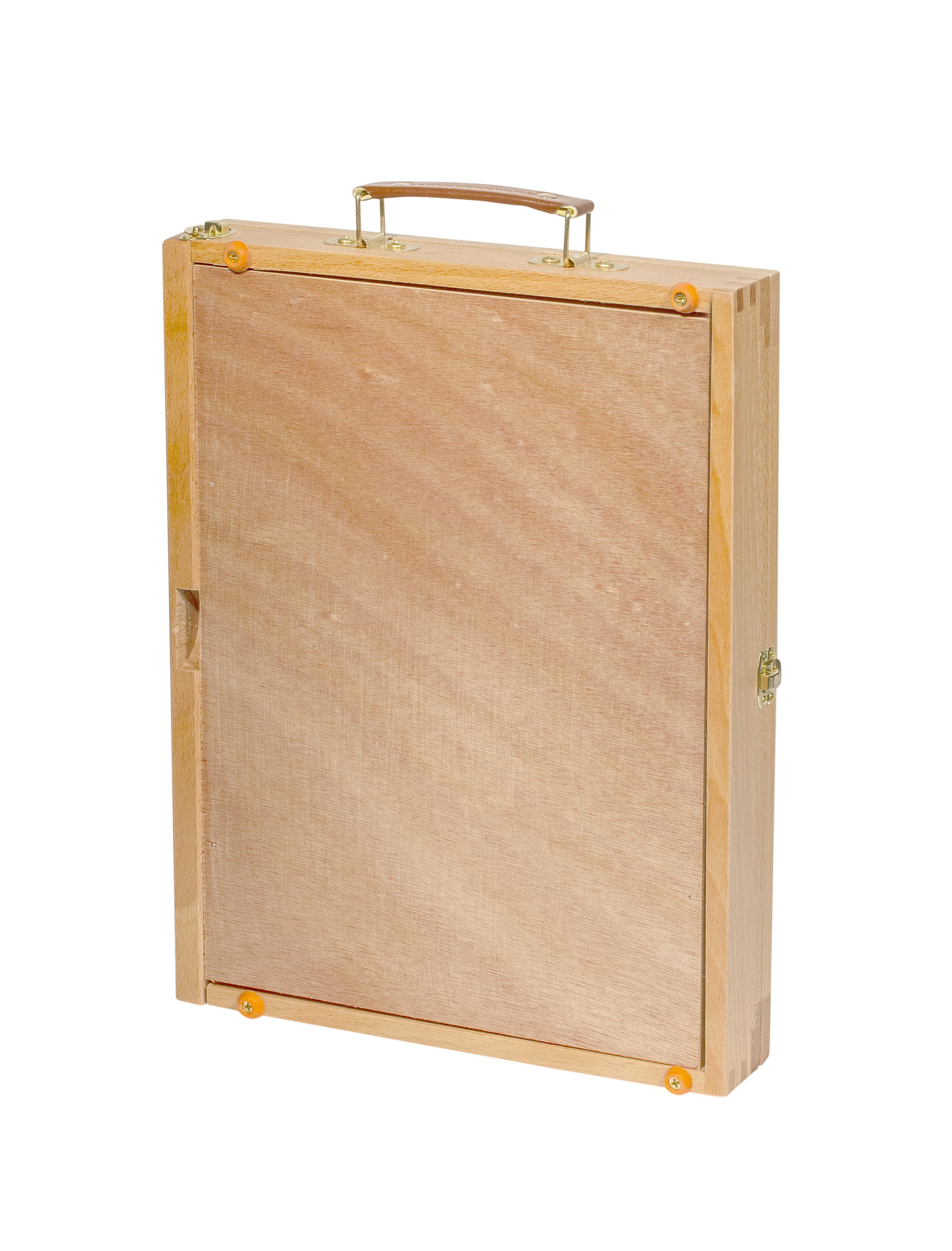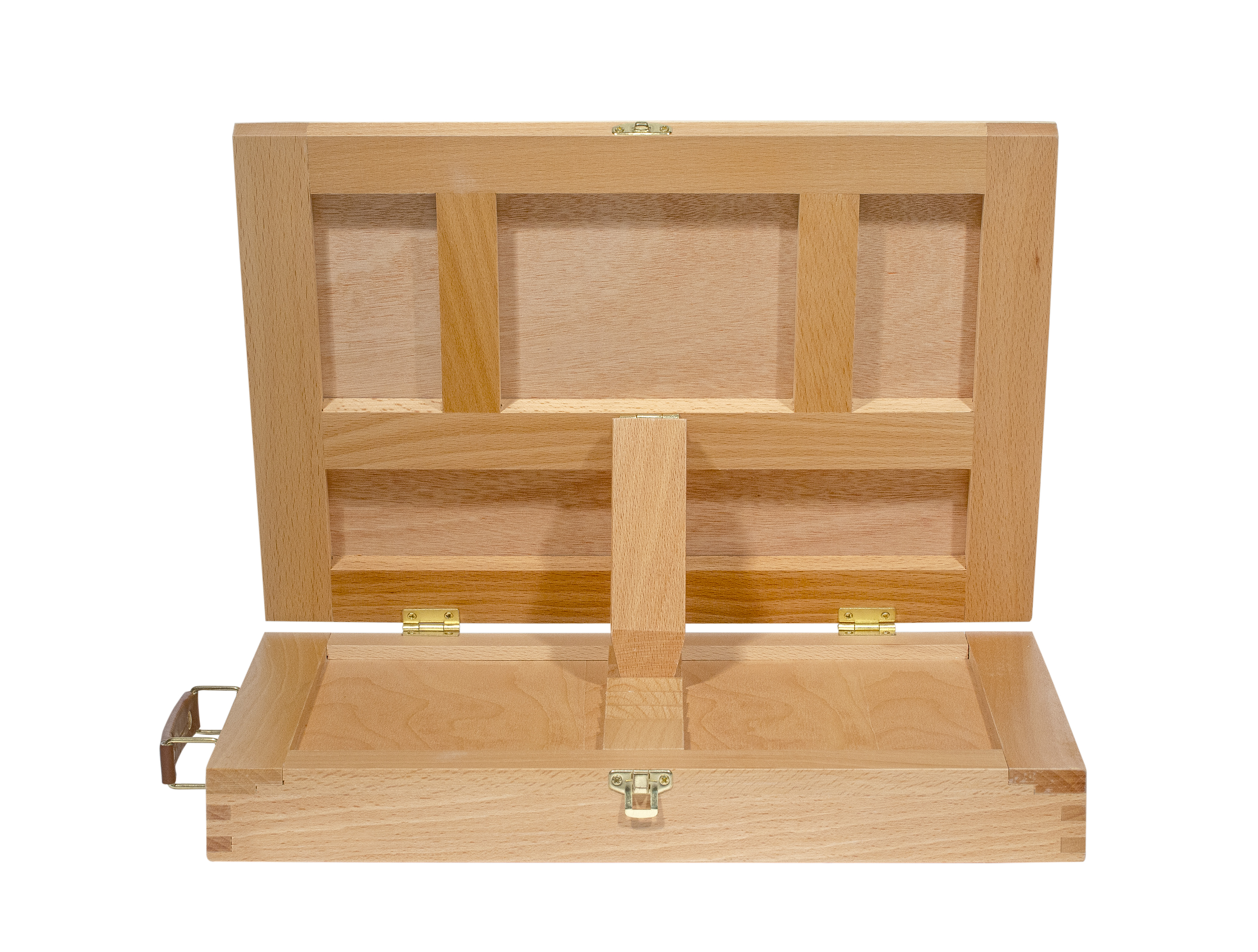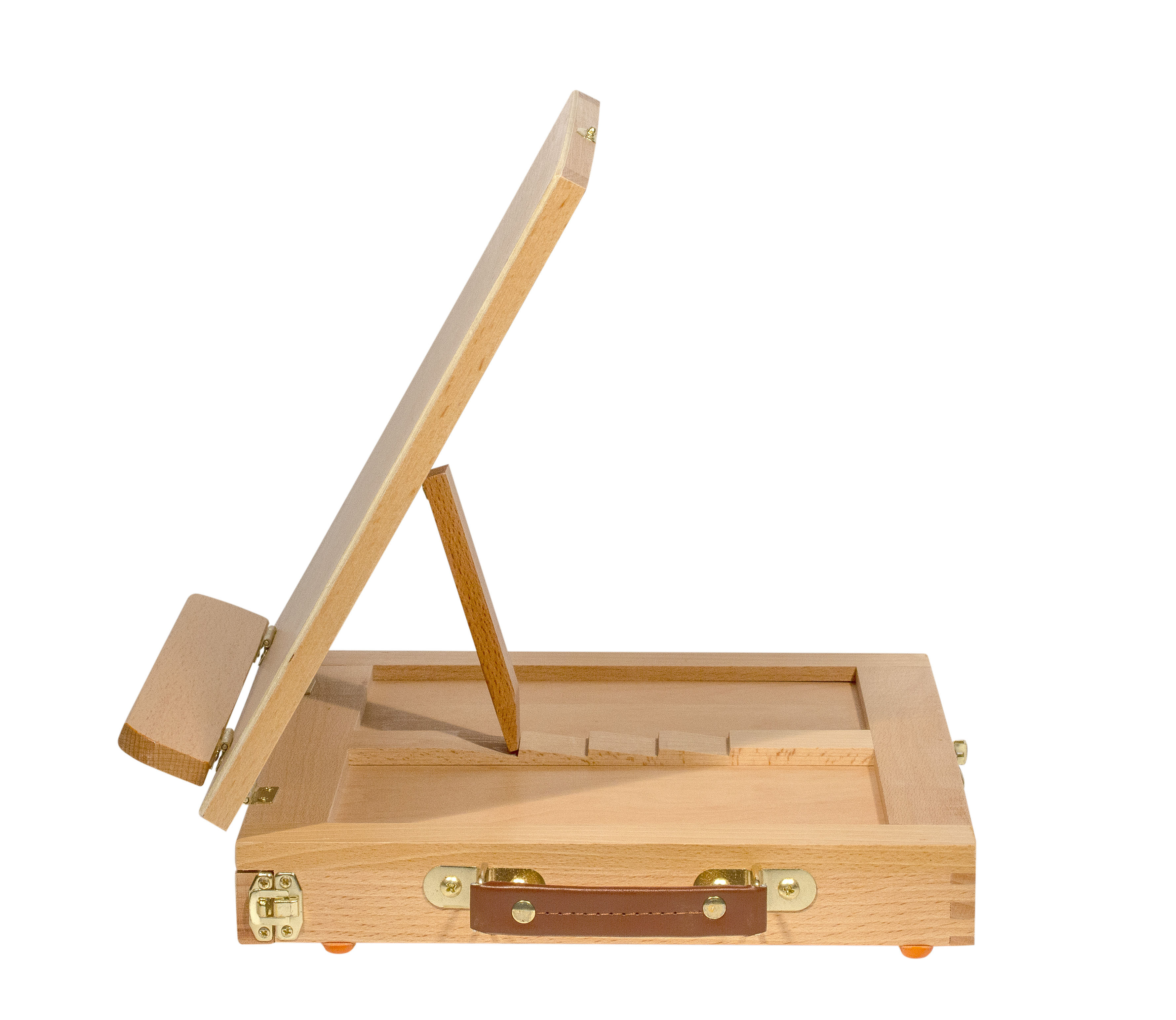 Настольный мольберт-этюдник из бука TE-01A представляет собой модернизацию модели TE-01A — вместо каркасного держателя холста в этой модели применили планшет размером 25*33см - мольберт вмещает лист формата А4 альбомной ориентации, что делает его поистине универсальным, его можно использовать и с холстами, и с бумажными основами для живописи. Планшет регулируется по наклону. Встроенный ящик для хранения художественных принадлежностей и палитры (поставляется в комплекте с мольбертом). Удобная ручка для переноски позволяет взять его на пленэр и использовать как компактный этюдник. Резиновые подпятники противостоят скольжению по поверхности стола. Планшет имеет 4 фиксированных положения регулировки по наклону. При использовании с холстом на подрамнике рекомендуемый высота холста в пределах 30см. Глубина выдвижного ящика - 2 см Вес: 1,56 кг