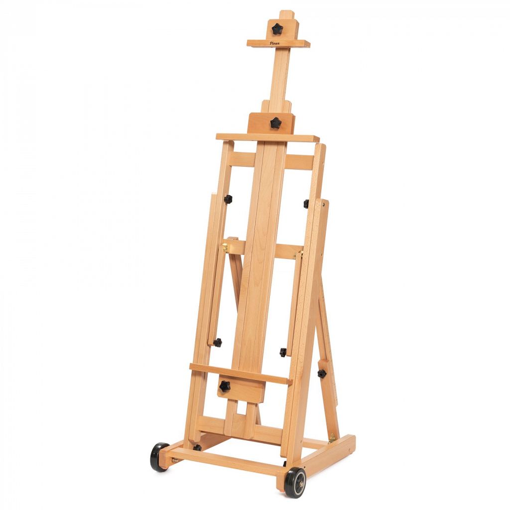 Многофункциональный портативный мольберт для студийной работы. Вмещает холст до 196 см. Преимущество данной модели в возможности закрепить два холста одновременно - это может быть удобно, например, при работе в студии над ранее сделанным на пленэре этюде. Вместо одного из холстов можно закрепить любой другой референс или даже электронный планшет. Основание на колесных опорах позволяет легко перемещать мольберт по студии. Угол наклона мачты регулируется в широких пределах и может принимать горизонтальное положение, что незаменимо для работы в акварельной и других живописных техниках, а также наклон вперед (идеально подходит для пастельных работ). В сложенном виде занимает мало места в помещении. Максимальная высота холста: 196 см. Вес: 13 кг.