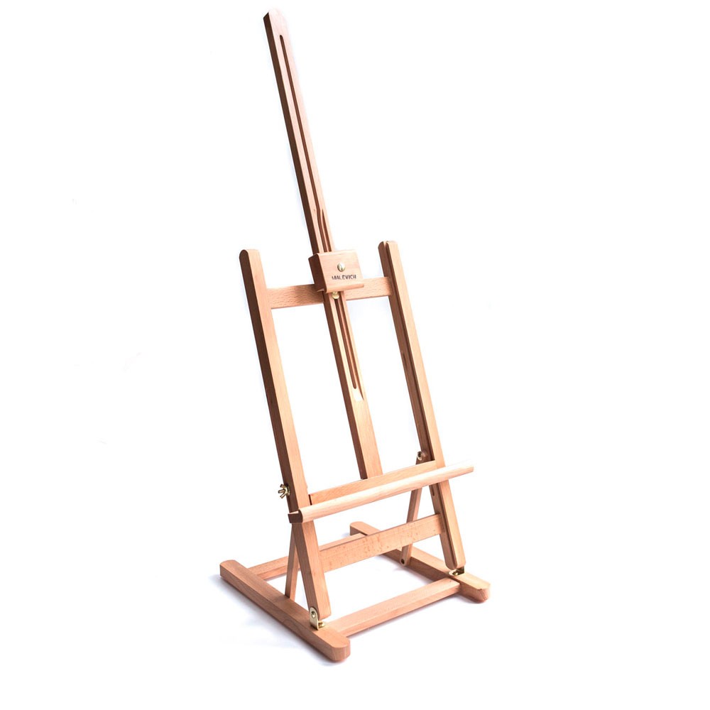 Настольный мольберт классической конструкции. Выполнен из промасленного бука. Нижняя полка и верхний бегунок регулируются по высоте. Угол наклона мольберта можно изменять. Максимальная высота холста - 63см. Основание - ширина 27.5см, длина 32см. Высота - от 80см до 102см. Вес - 1.4кг.