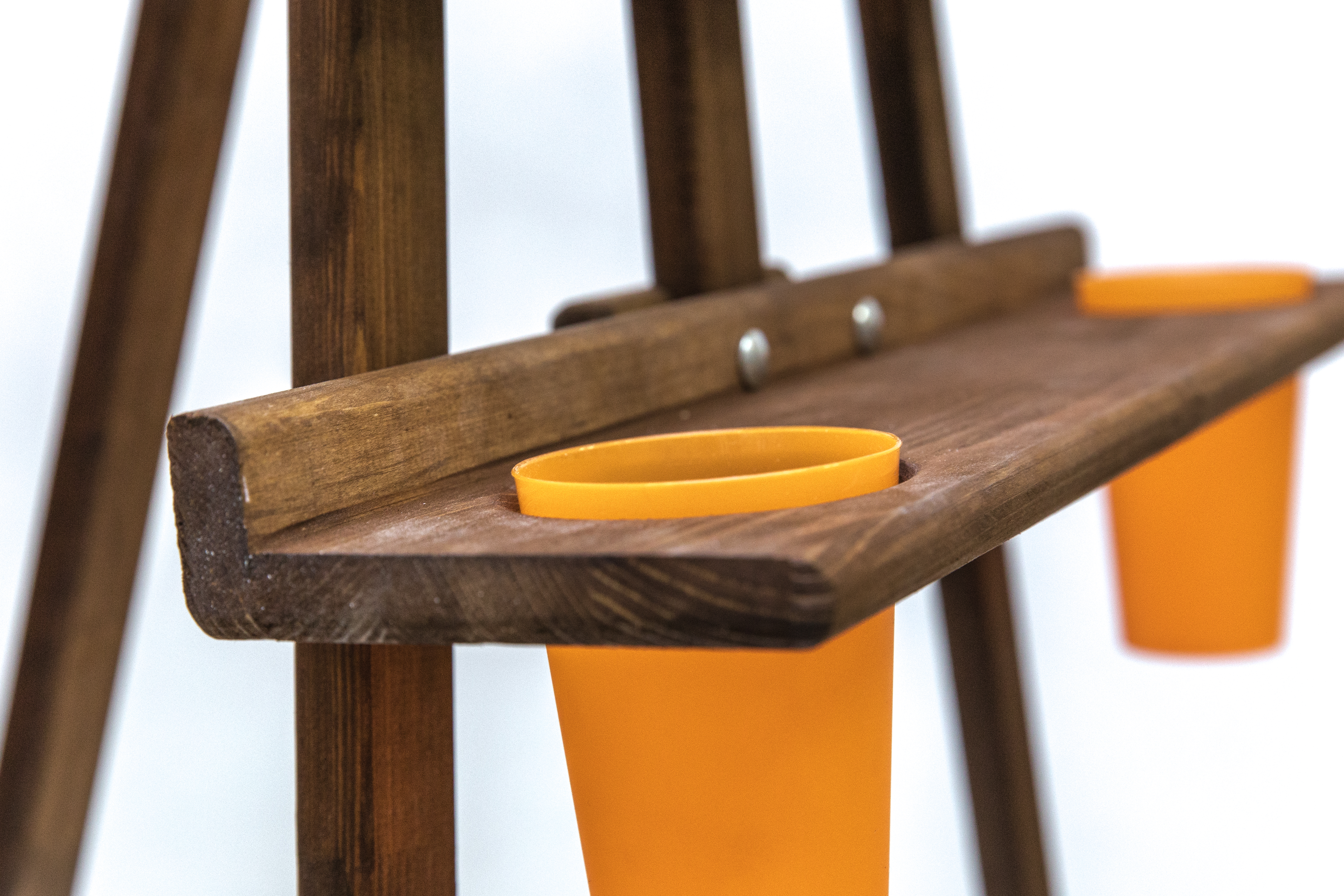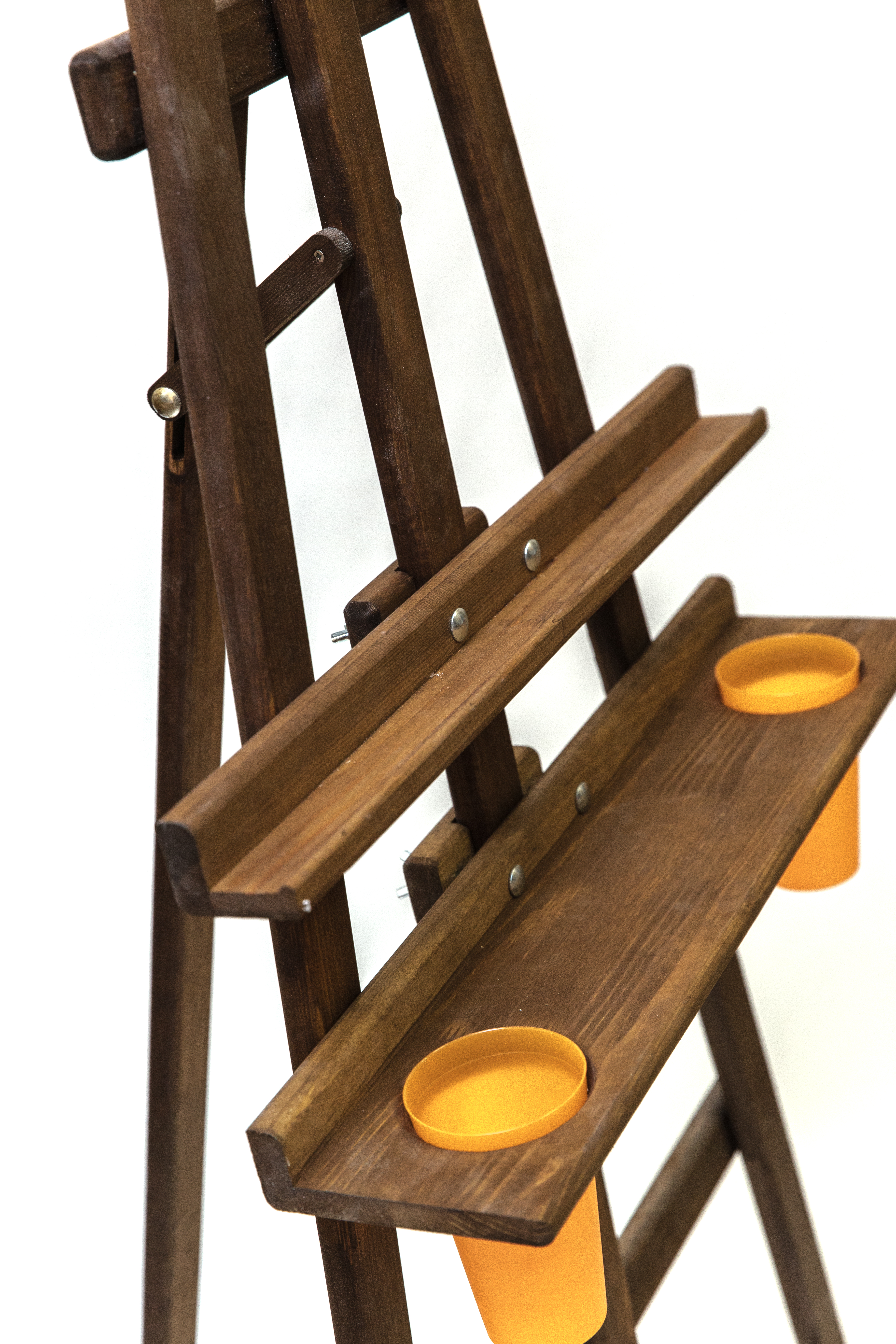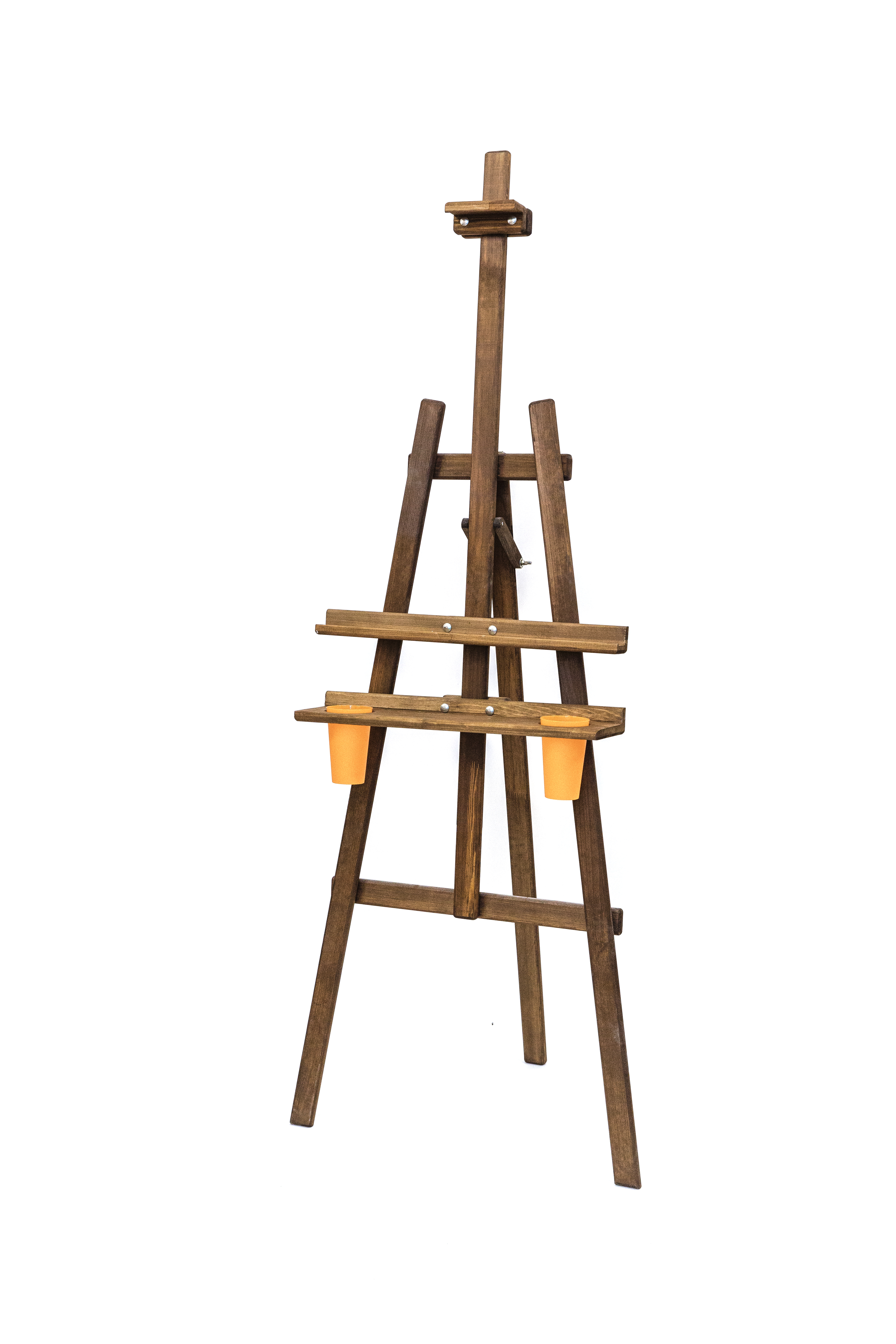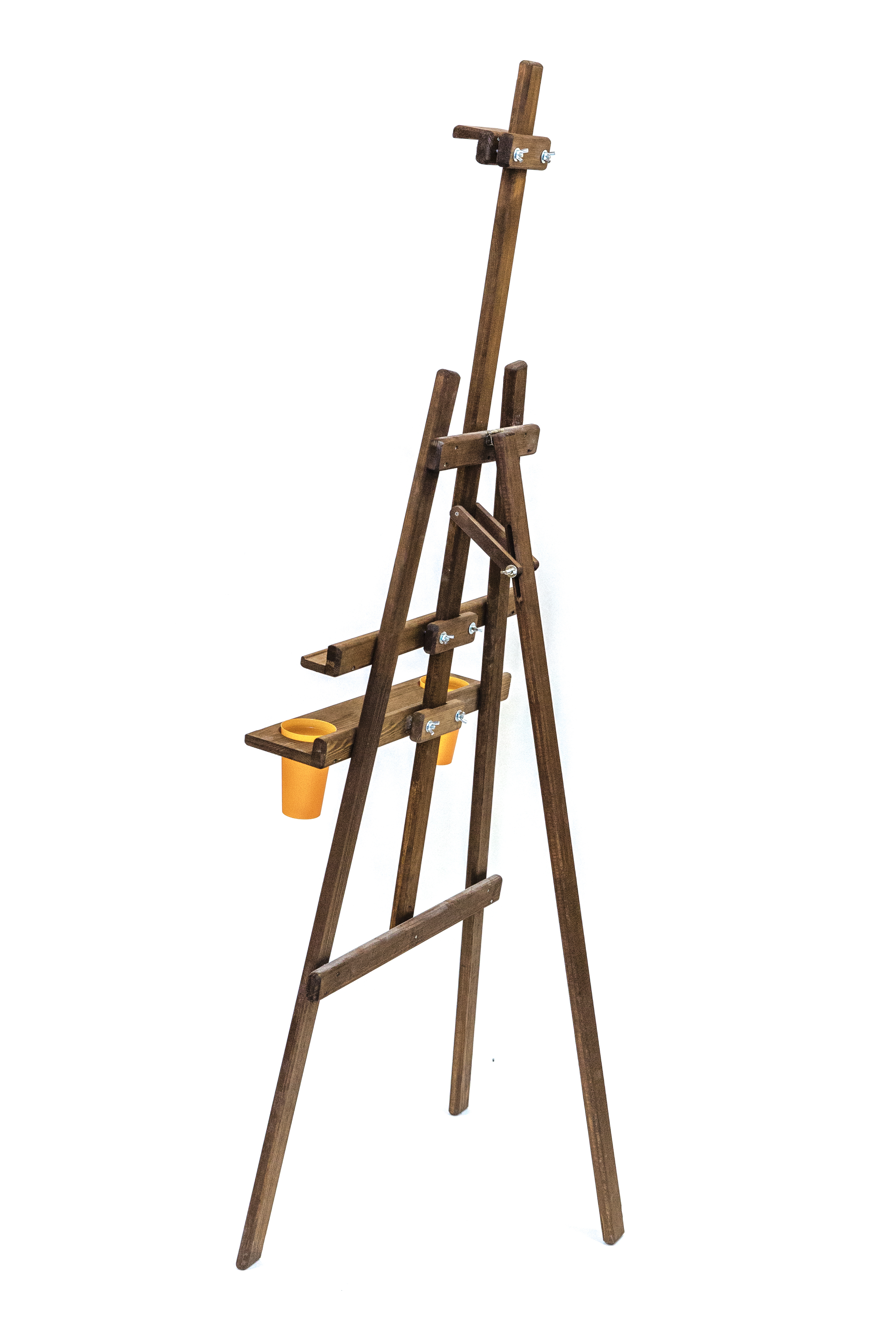 Мольберт Лира классической конструкции из натурального дерева. Угол наклона опорной ноги можно изменять, высота полки и фиксатора холста также регулируется. Оснащен дополнительной широкой полкой для инструментов с отверстиями для стаканов с водой или кистей (стаканы входят в комплект). Вторая полка также позволяет работать с двумя холстами одновременно, например, при создании копий. Бюджетный вариант мольберта с улучшенной функциональностью. Покрыт морилкой коричневого цвета. Высота 170 см, ширина 55 см, глубина от 20 до 120 см. Вес 5,1 кг. Ширина полки 55 см, глубина полки 3,5 см. Глубина дополнительной полки 11,5 см. Максимальная высота холста 120 см
