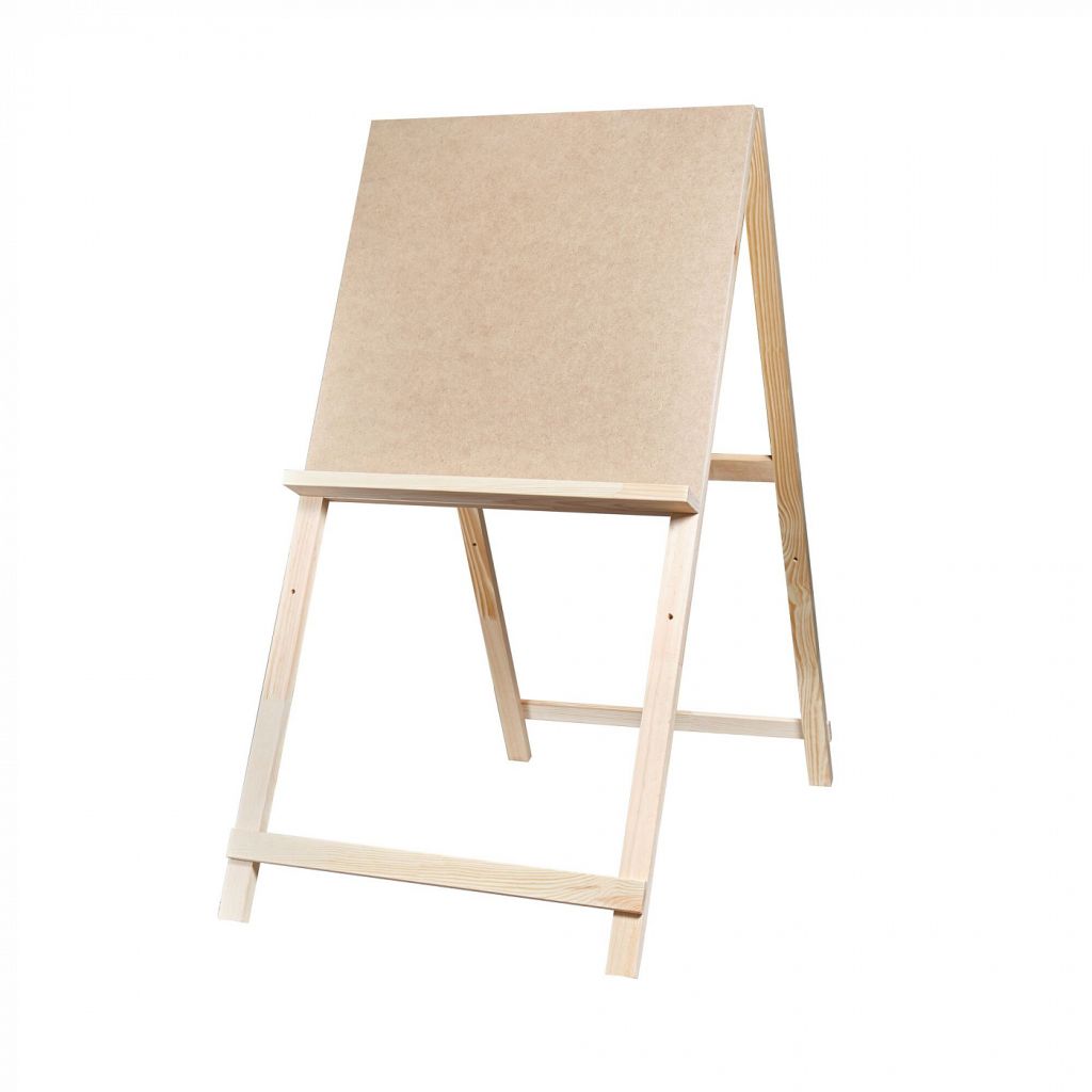 О модели: мольберты типа Хлопушка имеют четыре точки опоры и рабочую поверхность в виде планшета. Отсутствуют мачта и фиксаторы холста. Характеристика: каркас мольберта выполнен из древесины. Рабочая зона мольберта имеет формат 60*60 сантиметров, выполнена из фанеры. Угол наклона мольберта фиксируется при смене положения деревянной гребёнки, расположенной сбоку. На модели предусмотрена полка увеличенного размера, на которой можно расположить краски. Высота мольберта 120 сантиметров. В сложенном виде компактен и занимает мало места. Применение: рекомендуется для использования в художественных школах и детских студиях. Подходит для детей среднего возраста.