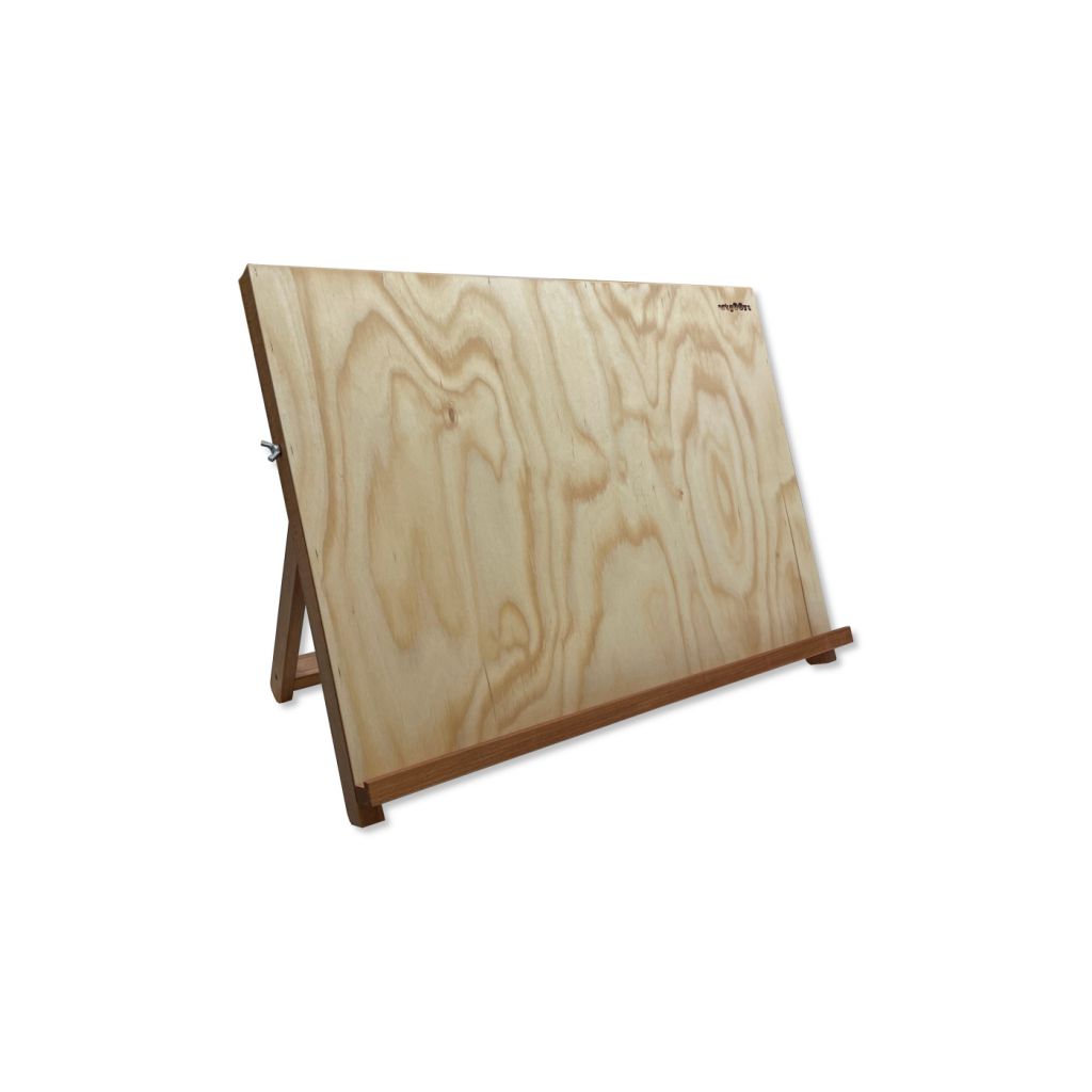 Небольшой настольный мольберт с фанерным планшетом и регулировкой наклона. Мольберт предназначен для эскизных работ на бумаге и картоне, а также для демонстрации картин, фотографий, рисунков. Мольберт изготовлен из высококачественного бука, который покрыт специальным защитным составом. Основа планшета — березовая фанера. Размер планшета 60х46 см.