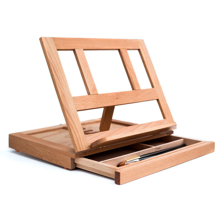Настольный мольберт с выдвижным ящиком отлично подходит для живописных работ любыми материалами. На подставке с регулируемым углом наклона предусмотрен выступ для планшета с бумагой. Складная контруция мольберта обеспечивает максимальную компактность и мобильность, в выдвижной ящик для художественных принадлежностей предполагает оптимальную организацию рабочего пространства в процессе работы. Максимальная высота холста 30 см. Ширина 34,5 см, глубина 26 см. Высота от 6,5 до 27 см. Вес 1,4 кг.