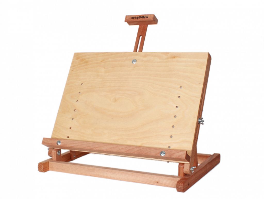 Небольшой комбинированный настольный мольберт с подъемной штангой. Мольберт предназначен для эскизных работ на бумаге и картоне, а также для демонстрации картин, фотографий, рисунков. Мольберт изготовлен из высококачественного бука, который покрыт специальным защитным составом. Оснащен подъемной штангой, регулировкой наклона и высоты полочки. Максимальная высота холста 54 см. Максимальный вес холста 3 кг. Размер основания 47.5х33 см.