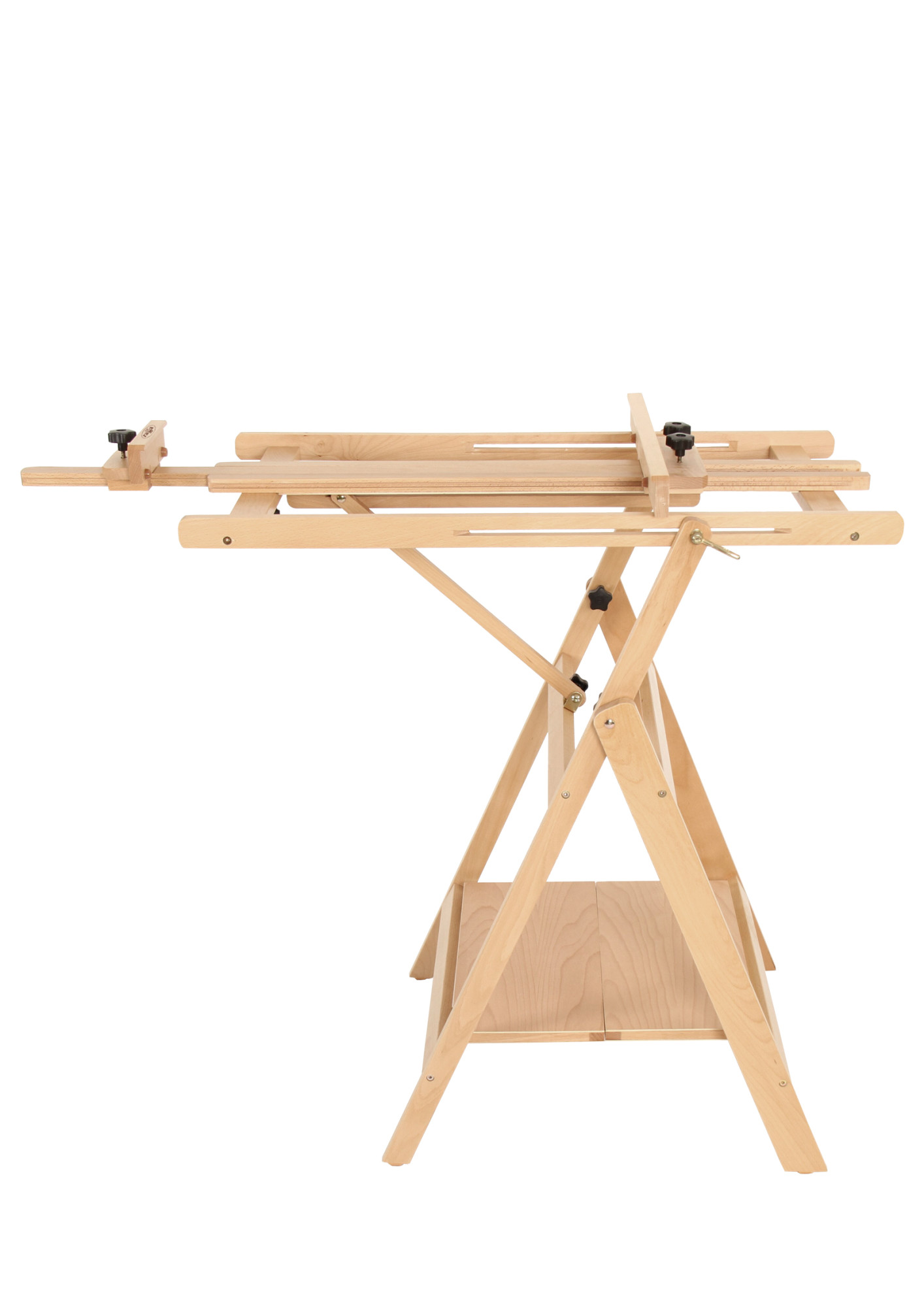 Профессиональный мольберт-трансформер для станковой живописи: в стандартном положении удобно работать с акрилом и маслом, в горизонтальном — акварелью. Оснащён простым механизмом изменения положения. Благодаря широкому основанию, усиленному полкой, устойчив даже при работе с большими форматами. Мольберт удобно хранить в сложенном виде. Характеристики: • Вид мольберта: напольный; • Тип: трансформер; • Складная конструкция; • Высота мольберта: 137(174) см; • Материал: лакированный бук; • Максимальный размер холста: 155 см. • Размер мольберта – 61*65,5*137(174) см.