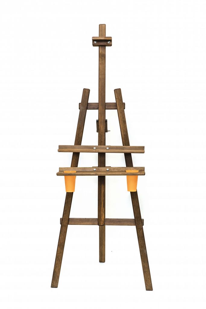 Мольберт Лира классической конструкции из натурального дерева. Угол наклона опорной ноги можно изменять, высота полки и фиксатора холста также регулируется. Оснащен дополнительной широкой полкой для инструментов с отверстиями для стаканов с водой или кистей (стаканы входят в комплект). Вторая полка также позволяет работать с двумя холстами одновременно, например, при создании копий. Бюджетный вариант мольберта с улучшенной функциональностью. Покрыт морилкой коричневого цвета. Высота 170 см, ширина 55 см, глубина от 20 до 120 см. Вес 5,1 кг. Ширина полки 55 см, глубина полки 3,5 см. Глубина дополнительной полки 11,5 см. Максимальная высота холста 120 см