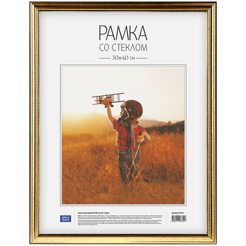Рамка пластиковая OfficeSpace "Basic" 21*30 см, небьющееся стекло, зол...
