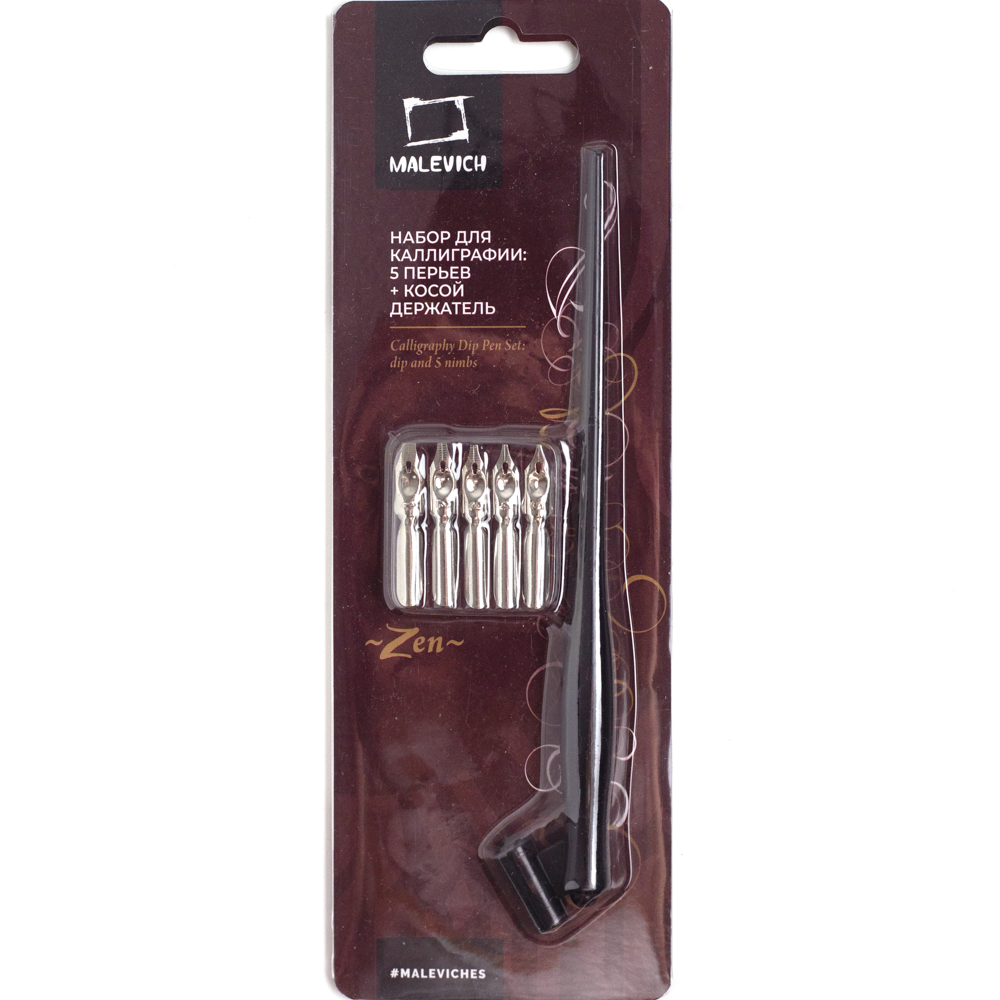 Набор для каллиграфии от бренда «Малевичъ» отлично подойдет тем, кто начал интересоваться искусством красивого письма. В наборе 5 перьев с различной толщиной наконечника и косой держатель. Перья и держатель универсальны и могут использоваться с инструментами для каллиграфии других брендов.