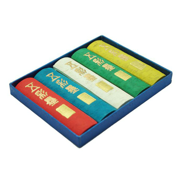 Набор для любителей каллиграфии и живописи. Включает в себя 5 брикетов с оттисками в виде дракона, размером 105х25х10 мм., вес каждого 47 гр. Оттенки приглушенные: - красный; - карибский зеленый; - бирюзово-голубой; - лимонно-желтый; - белый. Упакован в подарочную коробку. Для приготовления туши используйте камень для растирки. Брусок держите вертикально к камню и растирайте с усилием в небольшом количестве воды, до появления "сухой дорожки". Не храните готовую тушь, используйте сразу после растирания. Сухая тушь имеет приятный характерный аромат. После растирания и нанесения на работу такая тушь не дает блеска, а наоборот ложится матовым слоем с насыщенным цветом.