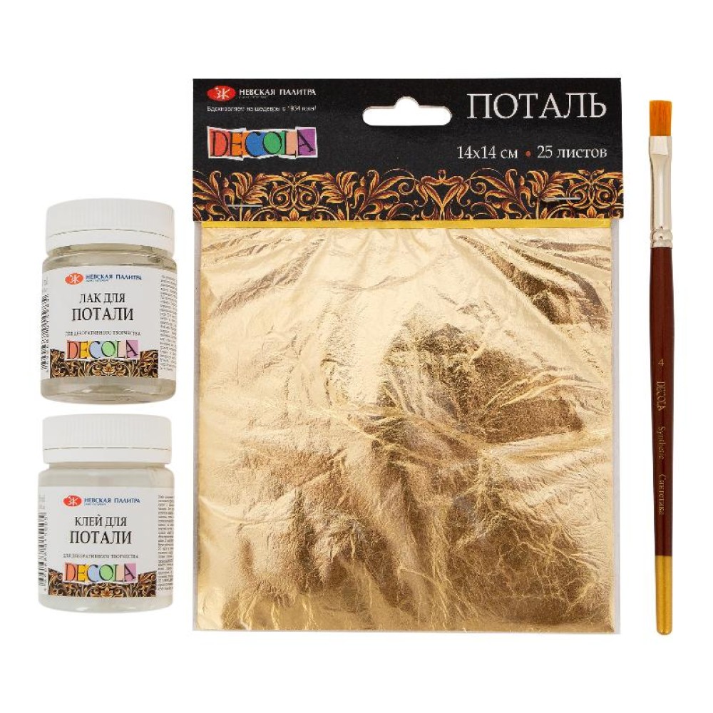 Набор для золочения Decola №2 включает в себя всё самое необходимое для того, чтобы ознакомиться с искусством золочения. Состав набора: Поталь в листах Decola, золото, 14х14 см, 25 листов; Кисть Синтетика Decola плоская, № 6 (10 мм); Клей для потали Decola, 50 мл.; Лак для потали Decola, 50 мл.