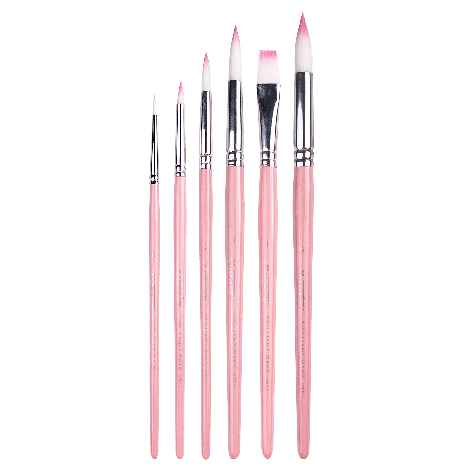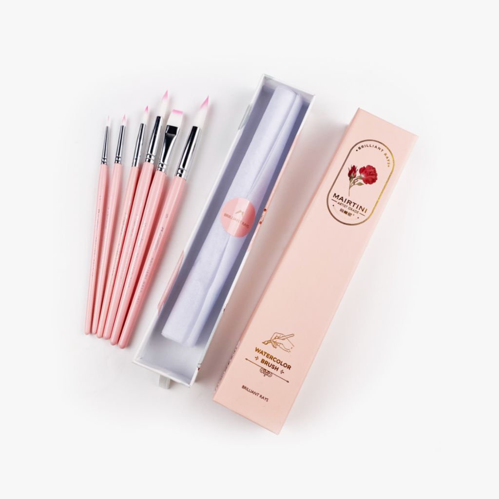 Набор кистей для акварели Mairtini "Brilliant Rays" Внутри 6 кистей белоснежного ворса с нежными розовыми кончиками. Разные размеры, плоские и круглые формы кистей не ограничивают вас в технике рисования. Состав набора: круглая кисть №0, №1, №2, №3, №5 плоская №4