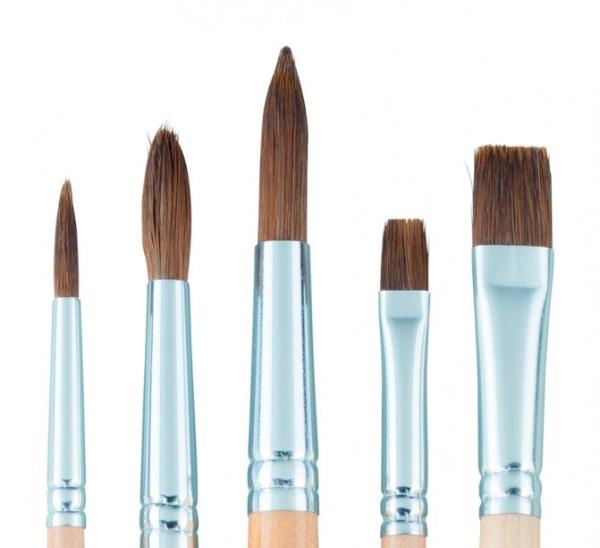 Комплектация: набор состоит из кистей, которые изготовлены из смеси ворса пони и синтетики. В наборе 5 кистей: 3 круглые кисти (№6, 10, 14) и 2 плоские (№8 и №14). Блистерная упаковка. Характеристика: для производства кистей, входящих в данный набор, использована смесь натурального ворса пони и синтетические нити. Такой материал популярен среди начинающих художников-акварелистов. Ворс кисти одновременно мягкий и упругий, он хорошо впитывает воду. При намокании кисти образуют тонкий и острый кончик, которым удобно прорисовывать точные линии. Применение: кисти, входящие в данный набор, подходят для использования с красками на водной основе (акварель, гуашь). Производство: производится в городе Апелдорн голландской компанией «ROYAL TALENS», которую основал Мартин Таленс (MartenTalens) в 1899 году. «ROYAL TALENS» производит все виды художественных красок и является одним из ведущих производителей в своей отрасли.