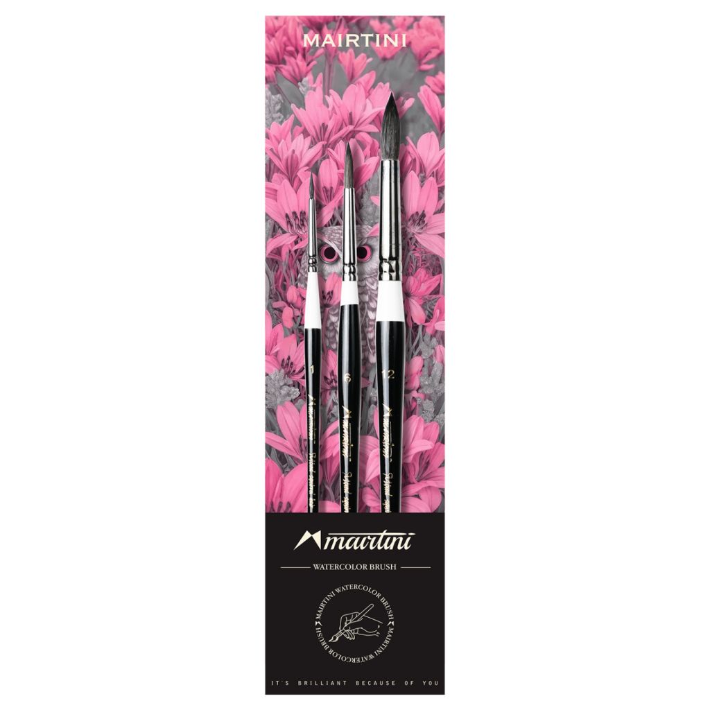 В комплекте набора кистей для акварели Mairtini "Mixed Squirrel" 3 круглые кисти из микса натурального беличьего и синтетического ворсов. За счёт сочетания этих материалов кисть становится более управляемой и долговечной. Этот комплект, идеально подойдет для любых акварельных техник и направлений. Номера кистей в наборе: №1, №6, №12