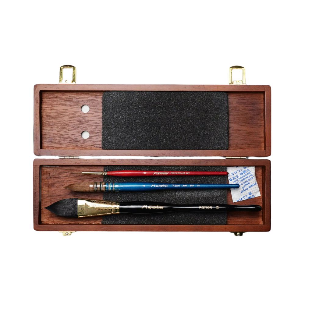 В комплекте набора кистей для акварели Mairtini в деревянной кейсе 3 кисти: кисть белка микс, кисть из ушной волос и кисть с ворсом микс норки и ушной волос. Кисти из микса натурального беличьего и синтетического ворсов. За счёт сочетания этих материалов кисть становится более управляемой и долговечной. Кисти производятся из ушного ворса, обладают оптимальными качествами эластичности и упругости, хорошо держат и отдают краску на поверхность. Пучок кистей обладает круглой удлиненной формой. Кисть с ворсом микс норки и ушной волос обладают эластичностью и упругостью, способствуют полному контролю над текучестью краски. Этот комплект, идеально подойдет для любых акварельных техник и направлений. Грамотно подобранные размеры кистей делают этот набор универсальным — им можно создавать как полноформатные работы, так и быстрые компактные зарисовки. Стильный деревянный кейс надёжно защитит кисти от повреждений. Крепкие металлические застёжки плотно фиксируют крышку пенала и не допускают спонтанного раскрывания. В кейсе есть отверстия необходимые для равномерного высыхания кистей после работы. Номера кистей в наборе: №4, №12