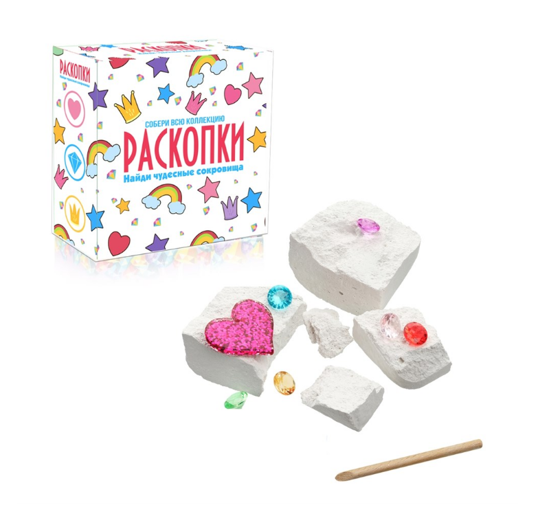 Перед вами набор для юных кладоискателей. Что внутри? Чудесные сокровища! Снимайте слои породы с помощью специального инструмента. Для того чтобы стало легче раскапывать сокровища, рекомендуем смочить брусок водой. Промойте находки и высушите. Сокровища теперь ваши!
