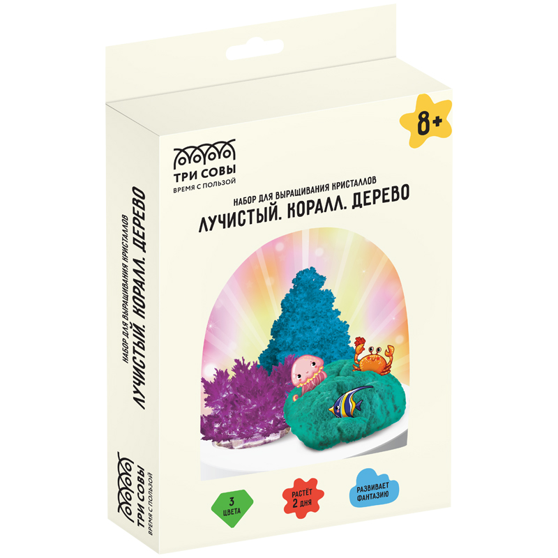 Набор для выращивания кристаллов «ТРИ СОВЫ» 3 в 1 позволит ребёнку всего за пару дней вырастить прекрасные кристаллы, в игровой форме приобщиться к научным знаниям и получить массу удовольствия! Цвета кристаллов: «Лучистый» – фиолетовый, «Коралл с морскими обитателями» – изумрудный, «Дерево» – голубой. Набор познакомит вашего ребенка с химическими процессами, поможет развить любознательность и позволит самостоятельно поставить первый научный эксперимент! Проводя опыт, ребенок сможет оценить форму, цвет, вид и структуру каждого кристалла. Набор подойдёт для детей от 8 лет.
