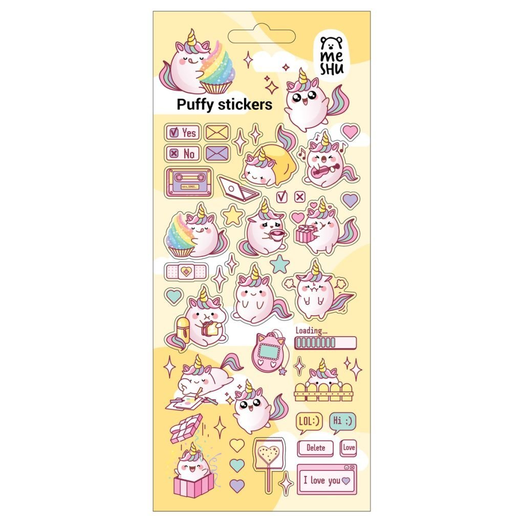 Яркие объёмные наклейки для декорирования MESHU идеально подходят для украшения любых поделок и отлично поднимают настроение. Наклейки выполнены в милом дизайне. Лист с наклейками представлен в размере 10*23 см. В упаковке от 10-15 объёмных наклеек, изготовленных из вспененных полимеров. Наклейки MESHU можно приклеить на открытку, подарочную упаковку, обложку ежедневника или тетради, предметы интерьера, мобильный телефон, ноутбук или любой другой аксессуар. Легко отделяются от основы и надежно держатся, а также их можно отклеить от одной поверхности и использовать повторно, ведь они многоразовые.