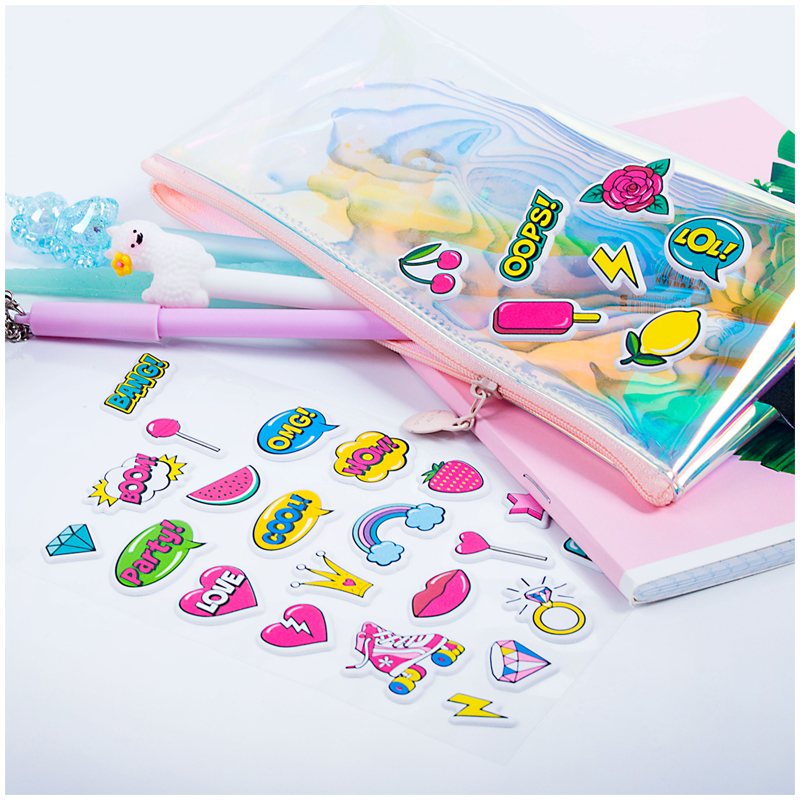 Яркие объёмные наклейки для декорирования MESHU идеально подходят для украшения любых поверхностей. Лист с наклейками представлен в размере 10*19 см. Наклейки изготовлены из вспененных полимеров. Наклейки MESHU можно приклеить на открытку, подарочную упаковку, обложку ежедневника или тетради, предметы интерьера, мобильный телефон, ноутбук или любой другой аксессуар. Легко отделяются от основы и надежно держатся, а также их можно отклеить от одной поверхности и использовать повторно, ведь они многоразовые. Набор наклеек упакован в пакет с европодвесом.
