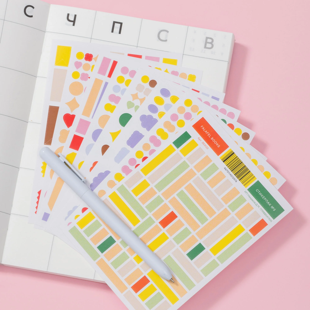 Стикерсет №3 вышел самым универсальным. Без лишних слов — только формы. Можно выделять главное и не отвлекаться на лишнее. Или использовать наклейки как подложку для заголовков страниц.