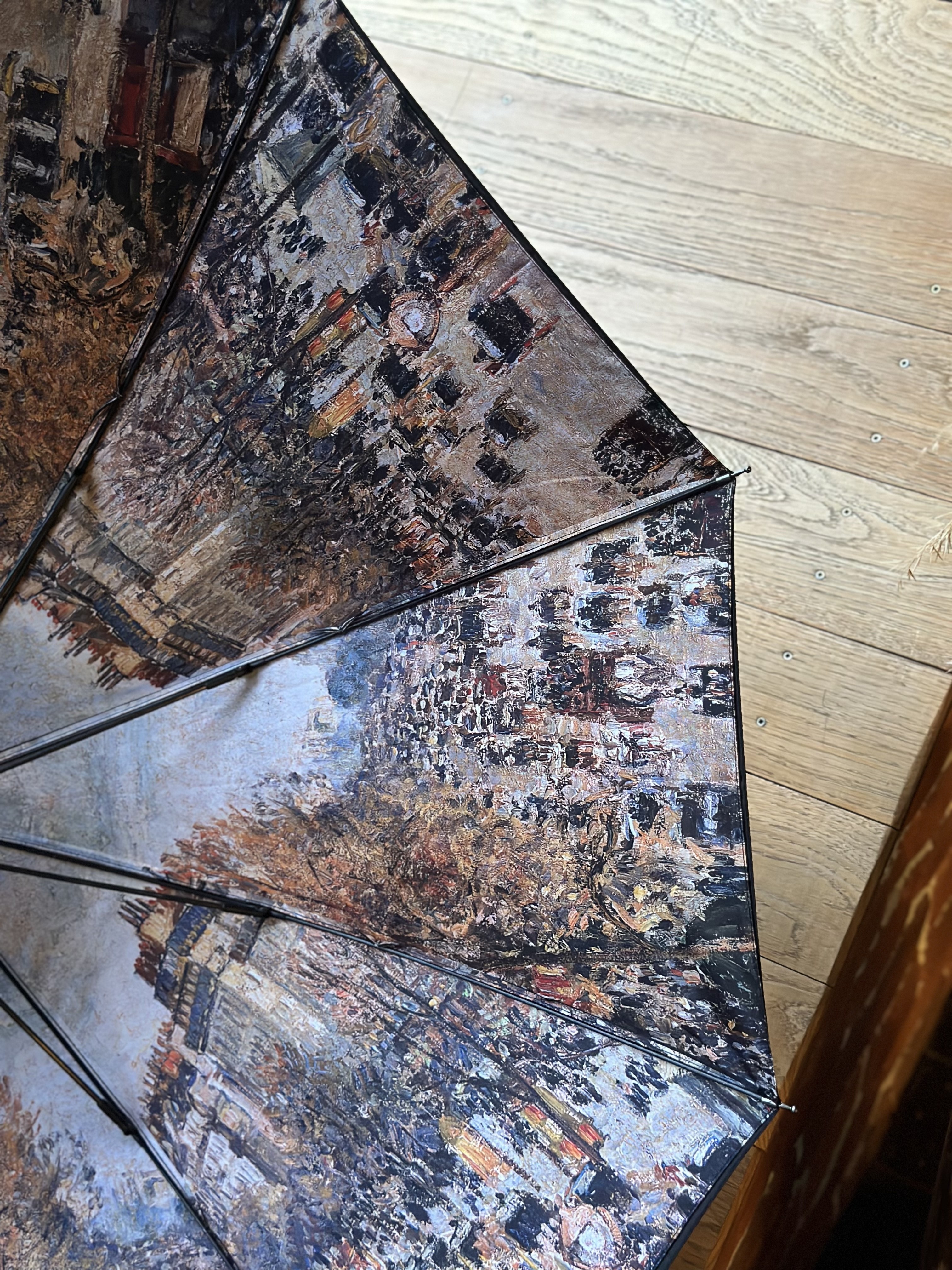 Классический двухкупольный зонт-трость из коллекции, посвящённой мастерам импрессионизма. Удобный и практичный аксессуар, большой диаметр (100 см.) которого позволит надёжно защититься от дождя. Внутренняя часть купола зонта украшена фрагментом картины Камиля Писсарро «Бульвар Монмартр» из собрания Государственного Эрмитажа.
