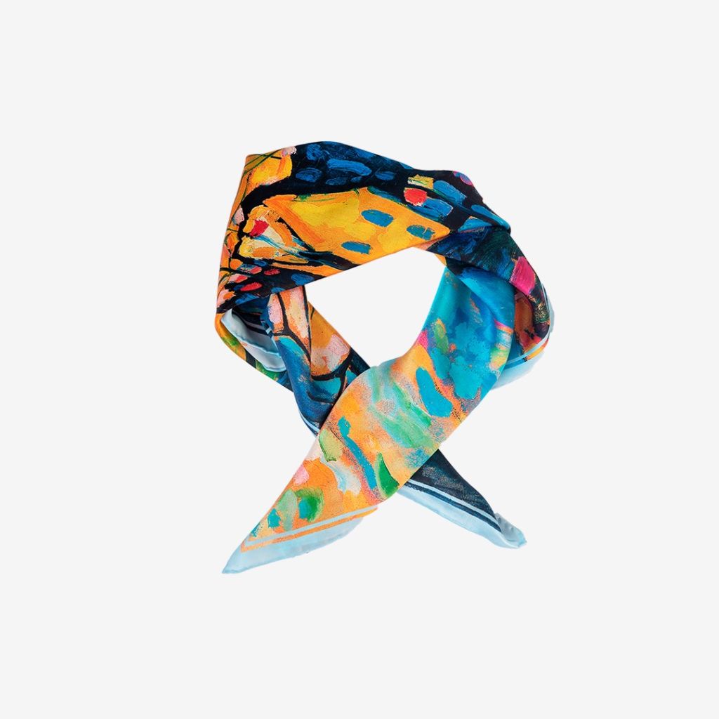 Эффектный шелковый платок из коллекции, посвященной наследию Василия Кандинского, украшен качественным принтом по мотивам одной из работ художника. Дизайн аксессуара создан по мотивам работы «Зимний пейзаж» из собрания Эрмитажа. Квадратный формат полотна позволяет использовать аксессуар по-разному и каждый раз создавать новый образ.
