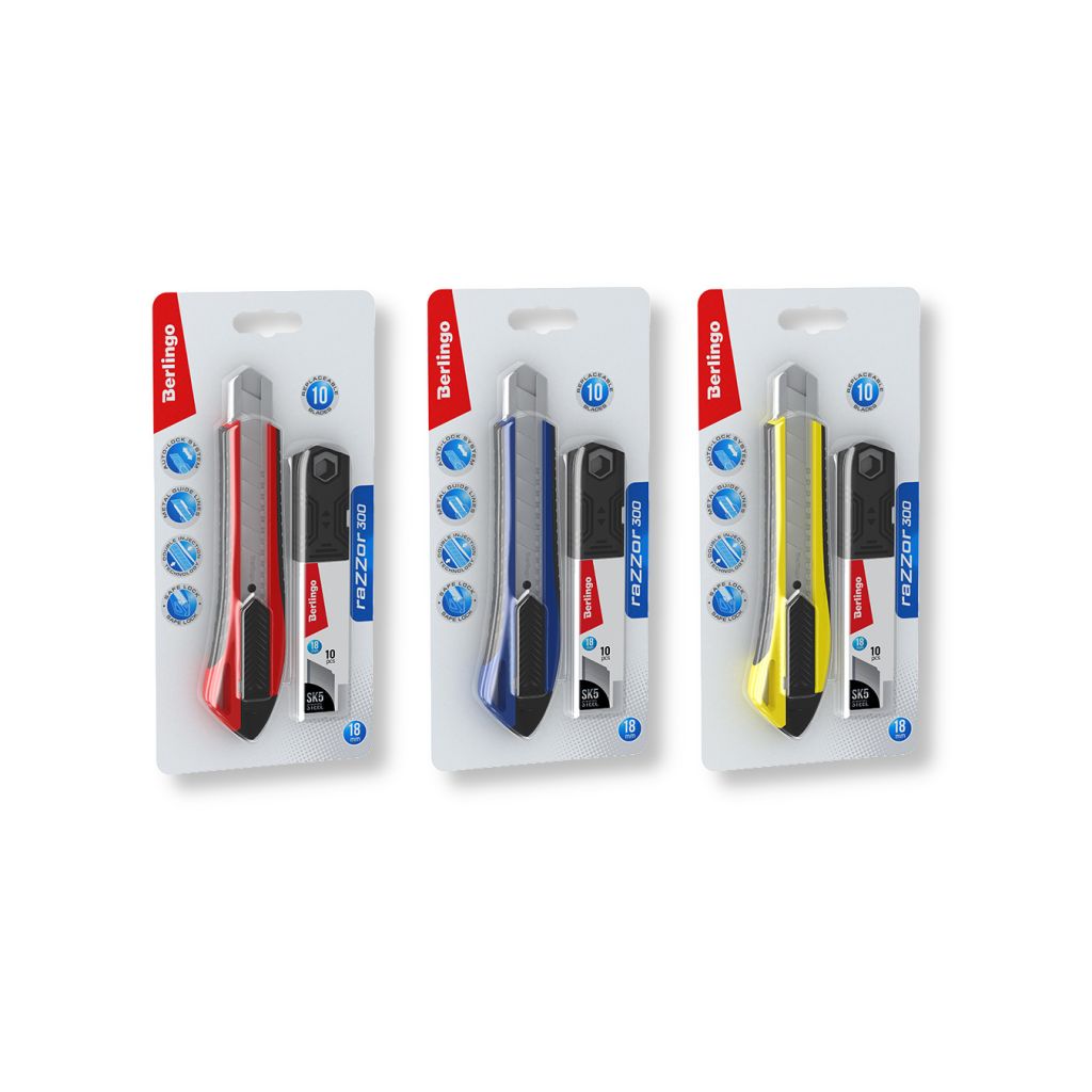 Канцелярский нож Berlingo серии Razzor 300 с автоматической системой фиксации лезвия auto-lock. Ширина лезвия: 18 мм. В комплекте 10 запасных лезвий из стали SK5 с углом 30°. Корпус ножа красного цвета выполнен из высококачественного ABS пластика с применением технологии двойного литья (прорезиненные вставки). Имеет металлические направляющие. Индивидуальная упаковка – блистер с европодвесом. На оборотной стороне блистера есть перфорация для более удобного извлечения инструмента из упаковки. Характеристики: • Материал корпуса: ABS пластик; • Ширина лезвия: 18 мм; • Механизм фиксации лезвия: автоматический.