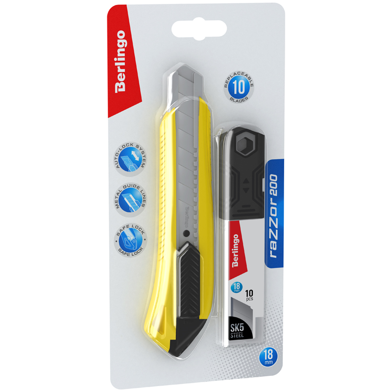 Канцелярский нож Berlingo серии Razzor 200 с автоматической системой фиксации лезвия auto-lock. Ширина лезвия: 18 мм. В комплекте 10 запасных лезвий из стали SK5 в пластиковом пенале. Корпус ножа желтого цвета выполнен из высококачественного ABS пластика. Имеет металлические направляющие. На оборотной стороне блистера есть перфорация для более удобного извлечения инструмента из упаковки.
