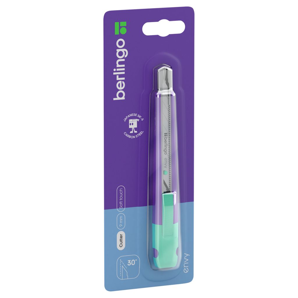 Канцелярский нож Berlingo кросс-серии Envy с автоматической системой фиксации лезвия auto-lock. Прочный корпус выполнен из качественного ABS-пластика с тактильно приятным покрытием soft-touch, что обеспечивает дополнительный комфорт при использовании и предотвращает скольжение пальцев. Износостойкое лезвие шириной 9 мм сделано из стали SK5 с углом заточки 30°, который гарантирует чёткость среза. Нож оснащён металлическими направляющими для плавного движения лезвия. Дизайн изделия — узнаваемая цветовая комбинация: сочетание фирменного фиолетового с пастельным зелёным оттенком. Индивидуальная упаковка – блистер с европодвесом. • Материал корпуса: ABS-пластик; • Ширина лезвия: 9 мм; • Цвет корпуса: зелёный; • Механизм фиксации лезвия: автоматический.