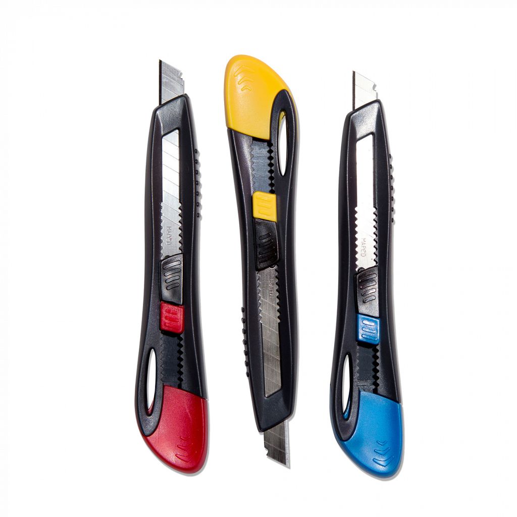 Нож канцелярский Maped. Эргономичный. Ручной фиксатор лезвия. Встроенный стопор лезвия. Пластиковый корпус черного цвета со вставкой. Ширина лезвия: 9 мм.