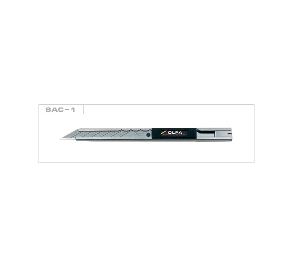 О товаре: нож SAC-1 – это классический нож с выдвижным сегментированным лезвием, который отличается ультратонкой конструкцией. Ножи данной модели используются для макетирования и графических работ, подойдет для профессиональных художников-оформителей. Нож оснащен лезвием с углом заточки 30°. Характеристика: корпус данной модели выполнен из нержавеющей стали. В задней части ножа находится съемная клипса с прорезью, которая позволяет без особого усилия удалять затупившиеся сегменты лезвия. Ножом SAC-1 можно с легкостью разрезать такие материалы, как полипропиленовая пленка (толщиной 10 миллиметров), картон, бумага, пенопласт. Совместимость: для ножей данной модели подходят лезвия OL-SAB-10B. Производство: изготавливается компанией OLFA («Олфа»). Она была основана в 1956 году в Японском городе Осака. Именно этой компанией впервые в мире был произведен нож, состоящий из сегментированного режущего полотна – нож с отламывающимся лезвием. За более чем полувековую историю компания разработала большое число новых моделей ножей и лезвий для различных целей и областей применения.