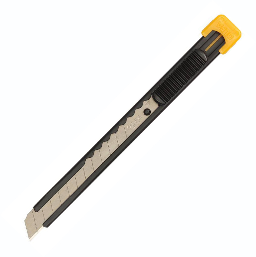 Характеристика: нож «S», производства компании OLFA, это классический ка ов металлическим корпусом черного цвета. Имеет полуавтоматический механизм фиксации положения лезвия. Для удобства пользования нож имеет пластиковую клипсу для крепления на одежду, дополнительно на клипсе имеется прорезь для безопасного отламывания затупившихся лезвий. Эргономичная форма корпуса позволяет с удобством пользоваться ножом правой и левой рукой. Нож комплектуется сегментированным лезвием, ширина которого 9 миллиметров. Применение: нож подходит для использования дома и в офисе. С лёгкостью режет бумагу, картон, скотч, плёнку и другие материалы. Производство: изготавливается компанией OLFA. Она была основана в 1956 году в Японском городе Осака. Именно этой компанией впервые в мире был произведен нож, состоящий из сегментированного режущего полотна – нож с отламывающимся лезвием. За более чем полувековую историю компания разработала большое число новых моделей ножей и лезвий для различных целей и областей применения.