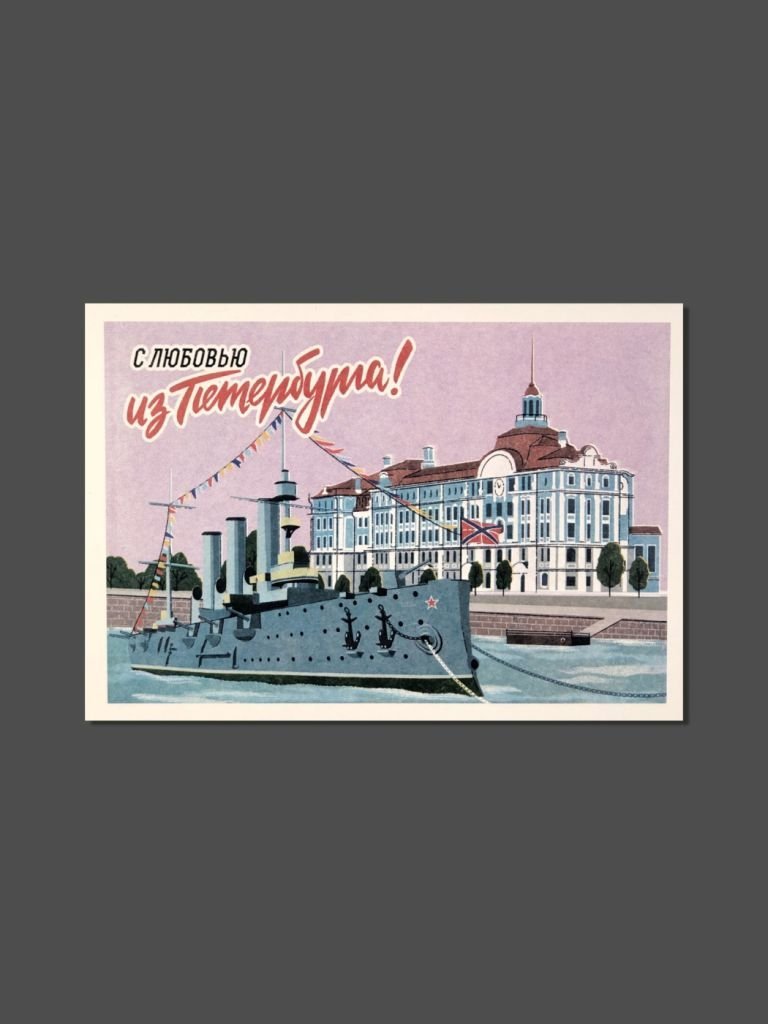 Открытка из плотного дизайнерского картона. На лицевой стороне открытки иллюстрация в ретро стиле с достопримечательностями Санкт-Петербурга, на обратной стороне есть поле для марки, линовка для адреса и место для самых тёплых слов и пожеланий.