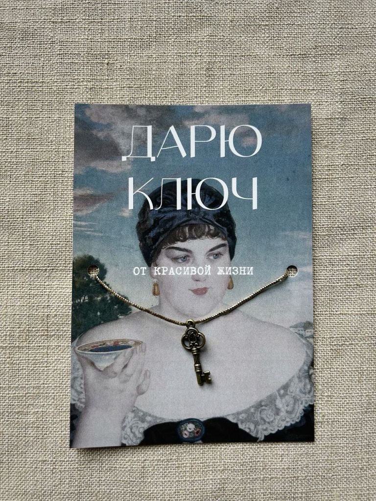 Открытки бренда отличаются качественной, приятной на ощупь шелковой ламинацией. Она помогает изделию надолго сохранить свой внешний вид и придает эстетичный матовый финиш. С обратной стороны предусмотрено место для памятной даты, подписи и имени отправителя. Каждый ключик уникален и может отличаться, но все равно останется очень красивым и аутентичным. В комплекте также есть крафтовый конвертик Радуйте любимых каждый день и пусть искусство всегда будет с вами.