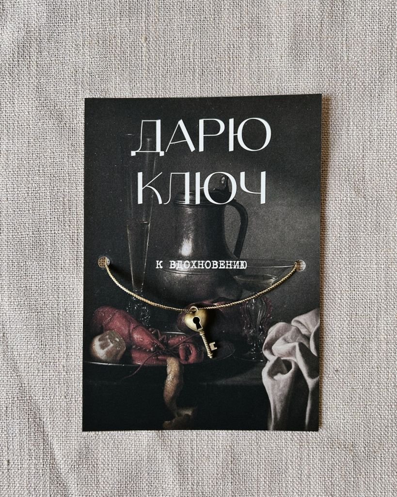 Открытки бренда отличаются качественной, приятной на ощупь шелковой ламинацией. Она помогает изделию надолго сохранить свой внешний вид и придает эстетичный матовый финиш. С обратной стороны предусмотрено место для памятной даты, подписи и имени отправителя. Каждый ключик уникален и может отличаться, но все равно останется очень красивым и аутентичным. В комплекте также есть крафтовый конвертик Радуйте любимых каждый день и пусть искусство всегда будет с вами.