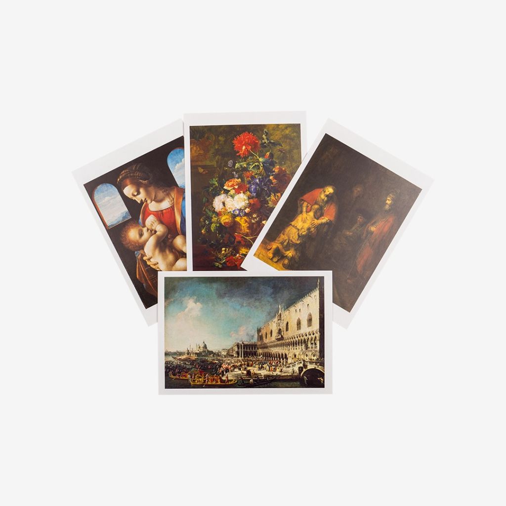 Коллекция сувенирной полиграфии представляет набор открыток "Шедевры живописи". Набор составлен из 16 работ известнейших художников Италии, Германии, Голландии, Фландрии, Испании, Великобритании, Франции XV - XX веков, таких как - Леонардо да Винчи, Лукас Кранах Старший, Бартоломе Эстебан Мурильо, Питер Пауль Рубенс, Рембрандт Харменс ван Рейн, Ян ван Хейсум, Каналетто, Каспар Давид Фридрих, Клод Моне, Камиль Писсарро, Поль Гоген и других. Набор открыток знакомит с различными живописными жанрами - портретом, пейзажем, натюрмортом, жанровыми сценками, библейскими сюжетами, и станет замечательным подарком - напоминанием о шедеврах из коллекции Эрмитажа.