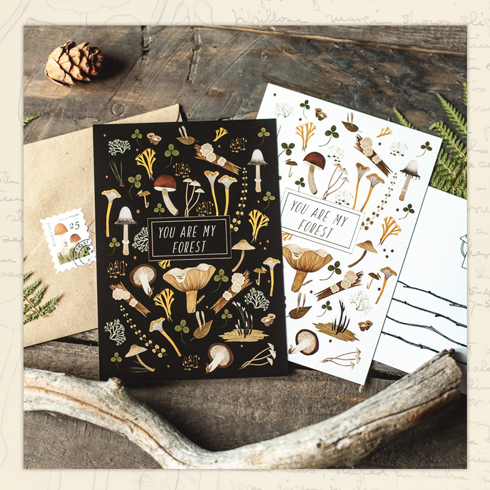 Авторские открытки с иллюстрациями талантливой художницы Александры Дворниковой созданы из плотной хлопковой бумаги, размер открытки стандартный 104х148 мм. На обратной стороне есть линовка для подписи, а также место под марку и адрес получателя. Иллюстрации Александры вдохновлены и наполнены бесконечной любовью к природе, очарованием леса и мистической красотой сказочных существ.