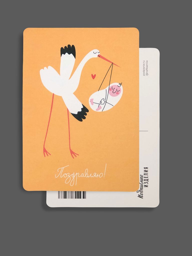 Открытка из плотного дизайнерского картона. На лицевой стороне открытки яркая авторская иллюстрация, на обратной стороне есть поле для марки, линовка для адреса и место для самых тёплых слов и пожеланий.