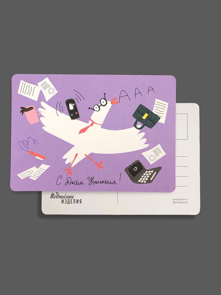 Открытка из плотного дизайнерского картона. На лицевой стороне открытки яркая авторская иллюстрация, на обратной стороне есть поле для марки, линовка для адреса и место для самых тёплых слов и пожеланий.